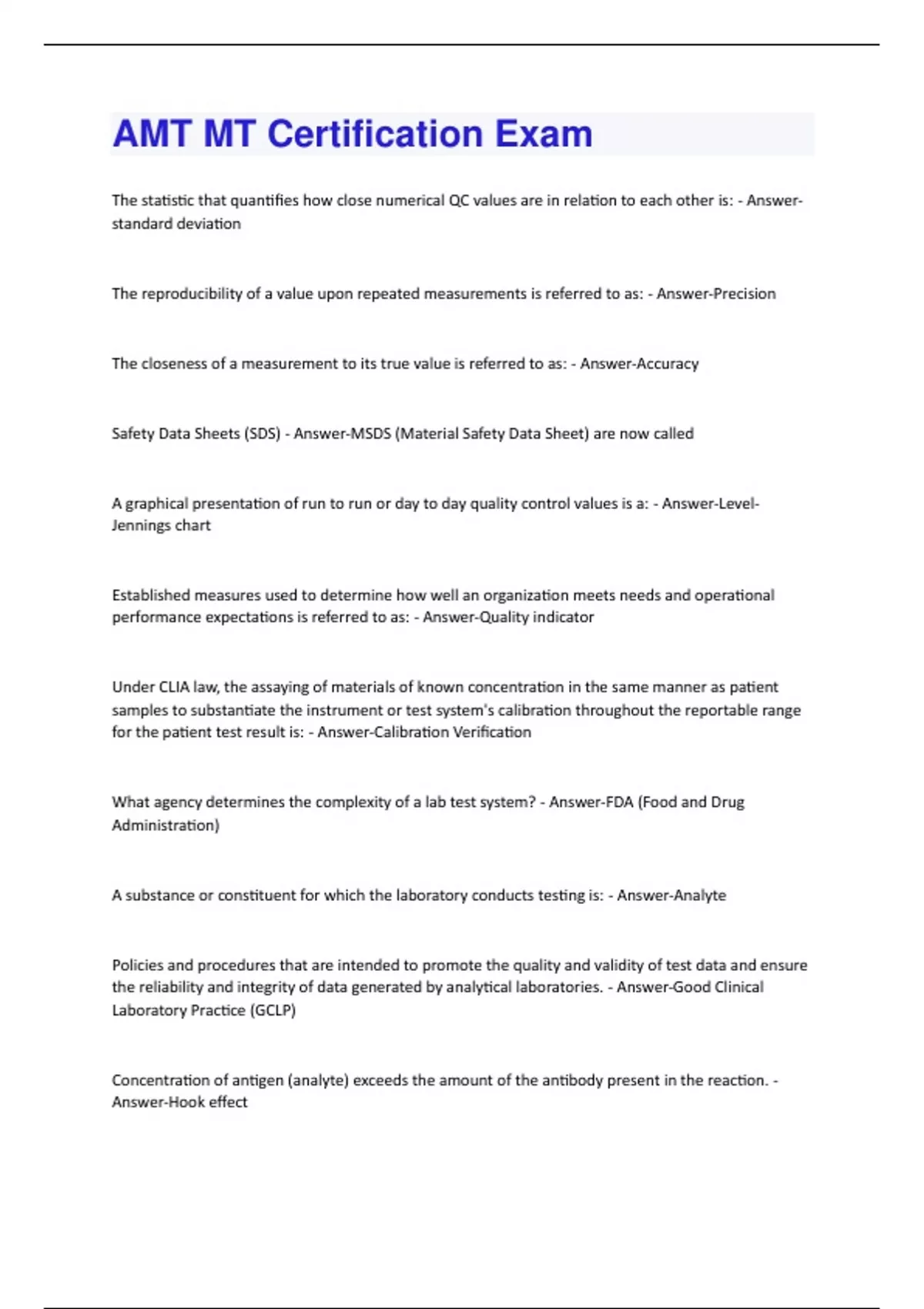 The statistic that quantifies how close numerical QC values are in relation to each other is: - Answerstandard deviation The reproducibility of a value upon repeated measurements is referred to as: - Answer-Precision The closeness of a measurement to its true value is referred to as: - Answer-Accuracy Safety Data Sheets (SDS) - Answer-MSDS (Material Safety Data Sheet) are now called A graphical presentation of run to run or day to day quality control values is a: - Answer-LevelJennings chart Established measures used to determine how well an organization meets needs and operational performance expectations is referred to as: - Answer-Quality indicator Under CLIA law, the assaying of materials of known concentration in the same manner as patient samples to substantiate the instrument or test system's calibration throughout the reportable range for the patient test result is: - Answer-Calibration Verification What agency determines the complexity of a lab test system? - Answer-FDA (Food and Drug Administration) A substance or constituent for which the laboratory conducts testing is: - Answer-Analyte Policies and procedures that are intended to promote the quality and validity of test data and ensure the reliability and integrity of data generated by analytical laboratories. - Answer-Good Clinical Laboratory Practice (GCLP) Concentration of antigen (analyte) exceeds the amount of the antibody present in the reaction. - Answer-Hook effectElectrophoresis support material that separates proteins on the basis of charge and molecular size - Answer-polyacrylamide gel An immunoassay methodology using either europium or phyconiliproteins would use which detection method? - Answer-Fluorometer