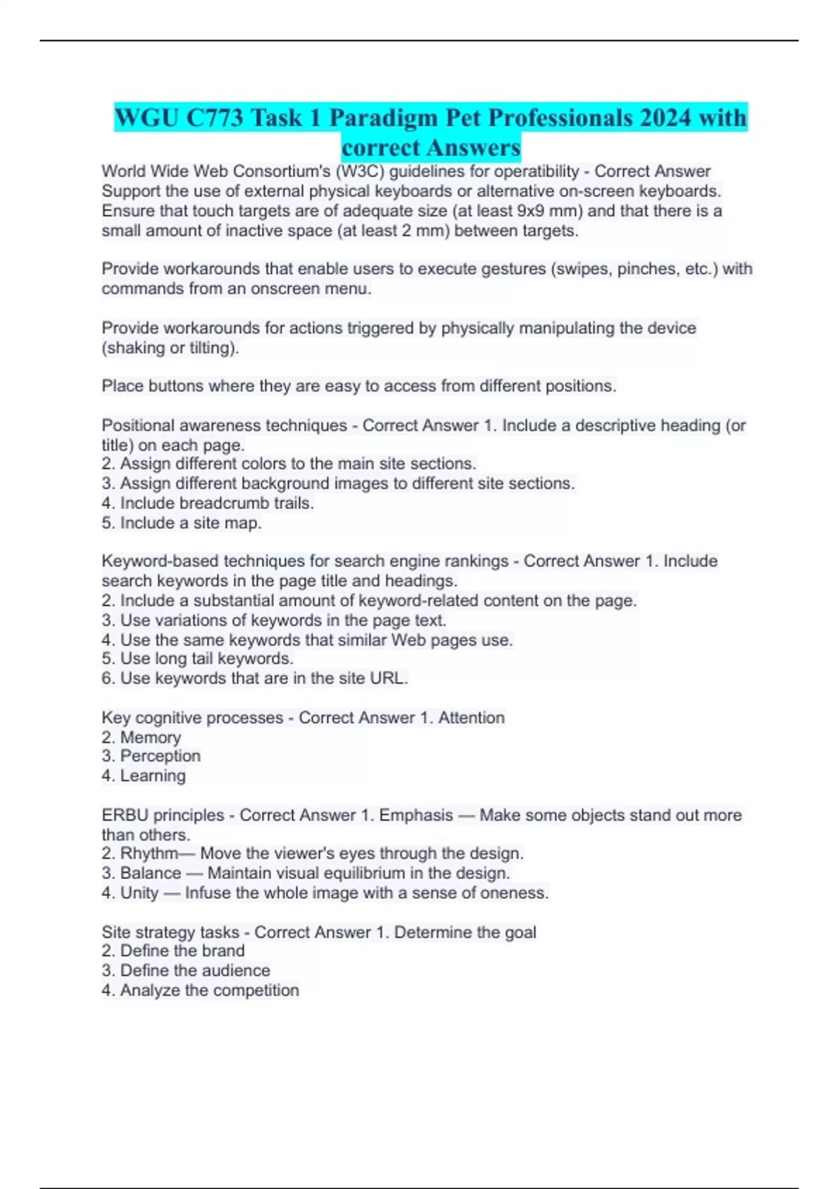 World Wide Web Consortium's (W3C) guidelines for operatibility - Correct Answer Support the use of external physical keyboards or alternative on-screen keyboards. Ensure that touch targets are of adequate size (at least 9x9 mm) and that there is a small amount of inactive space (at least 2 mm) between targets. Provide workarounds that enable users to execute gestures (swipes, pinches, etc.) with commands from an onscreen menu. Provide workarounds for actions triggered by physically manipulating the device (shaking or tilting). Place buttons where they are easy to access from different positions. Positional awareness techniques - Correct Answer 1. Include a descriptive heading (or title) on each page. 2. Assign different colors to the main site sections. 3. Assign different background images to different site sections. 4. Include breadcrumb trails. 5. Include a site map. Keyword-based techniques for search engine rankings - Correct Answer 1. Include search keywords in the page title and headings. 2. Include a substantial amount of keyword-related content on the page. 3. Use variations of keywords in the page text. 4. Use the same keywords that similar Web pages use. 5. Use long tail keywords. 6. Use keywords that are in the site URL. Key cognitive processes - Correct Answer 1. Attention 2. Memory 3. Perception 4. Learning ERBU principles - Correct Answer 1. Emphasis — Make some objects stand out more than others. 2. Rhythm— Move the viewer's eyes through the design. 3. Balance — Maintain visual equilibrium in the design. 4. Unity — Infuse the whole image with a sense of oneness. Site strategy tasks - Correct Answer 1. Determine the goal 2. Define the brand 3. Define the audience 4. Analyze the competition
