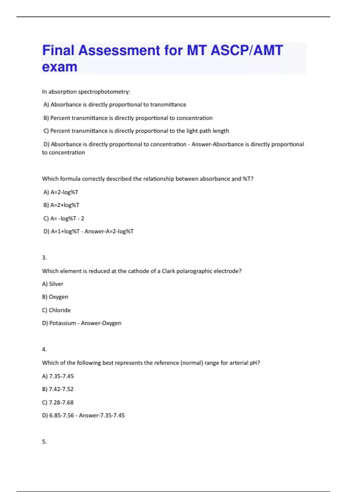 In absorption spectrophotometry: A) Absorbance is directly proportional to transmittance B) Percent transmittance is directly proportional to concentration C) Percent transmittance is directly proportional to the light path length D) Absorbance is directly proportional to concentration - Answer-Absorbance is directly proportional to concentration Which formula correctly described the relationship between absorbance and %T? A) A=2-log%T B) A=2+log%T C) A= -log%T - 2 D) A=1+log%T - Answer-A=2-log%T 3. Which element is reduced at the cathode of a Clark polarographic electrode? A) Silver B) Oxygen C) Chloride D) Potassium - Answer-Oxygen 4. Which of the following best represents the reference (normal) range for arterial pH? A) 7.35-7.45 B) 7.42-7.52 C) 7.28-7.68 D) 6.85-7.56 - Answer-7.35-7.45 5.What is the normal ration of bicarbonate to dissolved carbon dioxide in arterial blood? A) 1:10 B) 10:1 C) 20:1 D) 30:1 - Answer-20:1 6. A patient's blood gas results are as follows: pH = 7.26; dco2=2.0mmol/L; HCO3-=29mmol/L. These results would be classified as: A) Metabolic acidosis B) Metabolic alkalosis C) Respiratory acidosis D) Respiratory alkalosis - Answer-respiratory acidosis