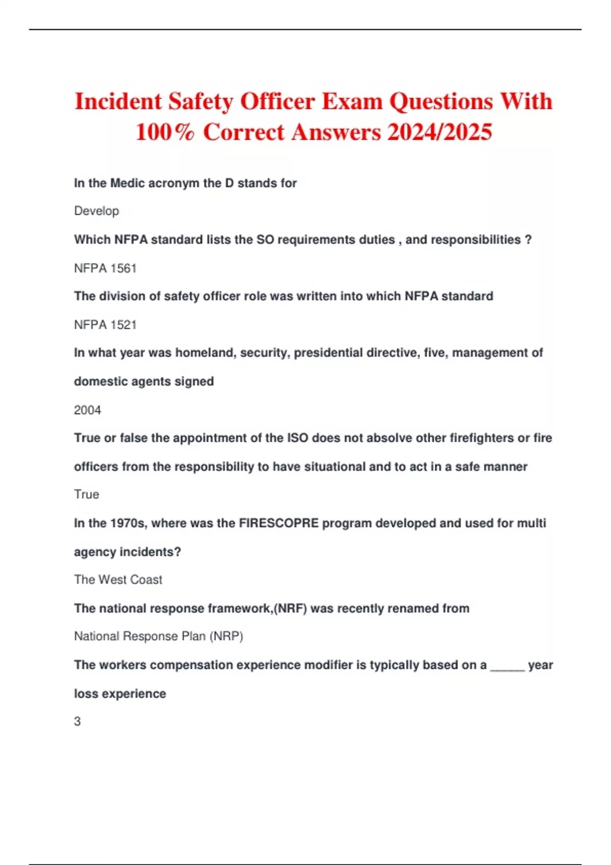 Incident Safety Officer Exam Questions With 100% Correct Answers 2024/2025 In the Medic acronym the D stands for Develop Which NFPA standard lists the SO requirements duties , and responsibilities ? NFPA 1561 The division of safety officer role was written into which NFPA standard NFPA 1521 In what year was homeland, security, presidential directive, five, management of domestic agents signed 2004 True or false the appointment of the ISO does not absolve other firefighters or fire officers from the responsibility to have situational and to act in a safe manner True In the 1970s, where was the FIRESCOPRE program developed and used for multi agency incidents? The West Coast The national response framework,(NRF) was recently renamed from National Response Plan (NRP) The workers compensation experience modifier is typically based on a _____ year loss experience 3 Who's role is it to focus on scene specific operations? The Incident safety officer, ISO Most line of duty deaths (LODDs) are? Stress (cardiac) related The HSO role is primarily: an administrative or managerial position. The first step in developing a formal SOP is establishing an administrative process to create, edit, alter, or delete established processes. The department's safety _________ is made up of the ideas, skills, and customs that are passed from one "generation" to another. culture True or false in some cases, equipment designed to improve safety, can actually lead to greater risk taking True The definition of a well written SOP is Firefighters follow it Before a hazard can be evaluated, it needs to be: identified All the following are factors to be addressed in personal aspect of the operational safety Triad except. Observational Skills When did the issue of responders mental health start gaining attention with formal and informal critical incident, stress management (CISM) program