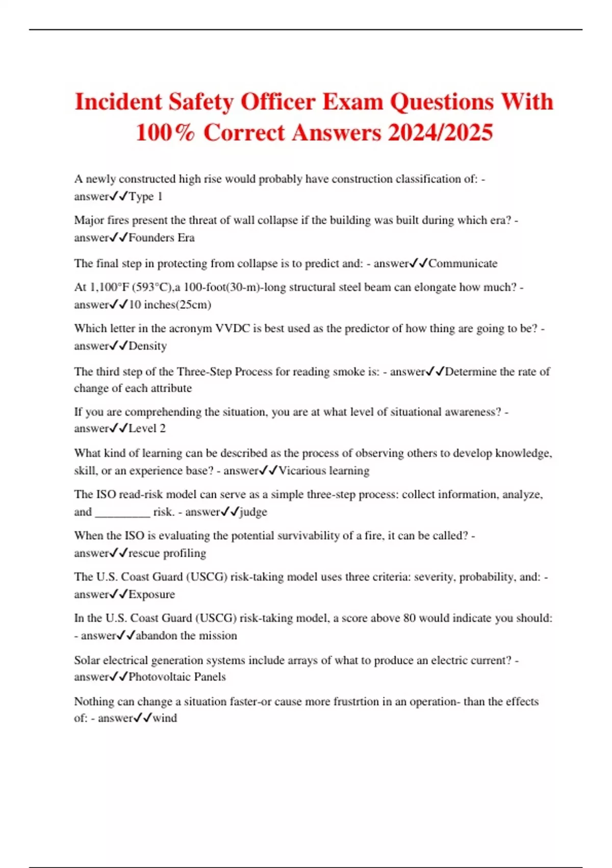 Incident Safety Officer Exam Questions With 100% Correct Answers 2024/2025 A newly constructed high rise would probably have construction classification of: - answerType 1 Major fires present the threat of wall collapse if the building was built during which era? - answerFounders Era The final step in protecting from collapse is to predict and: - answerCommunicate At 1,100°F (593°C),a 100-foot(30-m)-long structural steel beam can elongate how much? - answer10 inches(25cm) Which letter in the acronym VVDC is best used as the predictor of how thing are going to be? - answerDensity The third step of the Three-Step Process for reading smoke is: - answerDetermine the rate of change of each attribute If you are comprehending the situation, you are at what level of situational awareness? - answerLevel 2 What kind of learning can be described as the process of observing others to develop knowledge, skill, or an experience base? - answerVicarious learning The ISO read-risk model can serve as a simple three-step process: collect information, analyze, and _________ risk. - answerjudge When the ISO is evaluating the potential survivability of a fire, it can be called? - answerrescue profiling The U.S. Coast Guard (USCG) risk-taking model uses three criteria: severity, probability, and: - answerExposure In the U.S. Coast Guard (USCG) risk-taking model, a score above 80 would indicate you should: - answerabandon the mission Solar electrical generation systems include arrays of what to produce an electric current? - answerPhotovoltaic Panels Nothing can change a situation faster-or cause more frustrtion in an operation- than the effects of: - answerwind