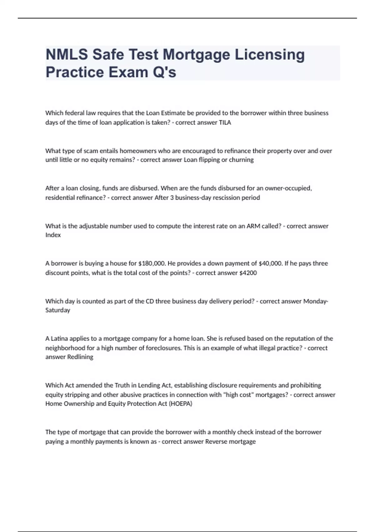 NMLS Safe Test Mortgage Licensing Practice Exam With Complete Answers 2024. Which federal law requires that the Loan Estimate be provided to the borrower within three business days of the time of loan application is taken? - correct answer TILA What type of scam entails homeowners who are encouraged to refinance their property over and over until little or no equity remains? - correct answer Loan flipping or churning After a loan closing, funds are disbursed. When are the funds disbursed for an owner-occupied, residential refinance? - correct answer After 3 business-day rescission period What is the adjustable number used to compute the interest rate on an ARM called? - correct answer Index A borrower is buying a house for $180,000. He provides a down payment of $40,000. If he pays three discount points, what is the total cost of the points? - correct answer $4200 Which day is counted as part of the CD three business day delivery period? - correct answer Monday-Saturday A Latina applies to a mortgage company for a home loan. She is refused based on the reputation of the neighborhood for a high number of foreclosures. This is an example of what illegal practice? - correct answer Redlining Which Act amended the Truth in Lending Act, establishing disclosure requirements and prohibiting equity stripping and other abusive practices in connection with "high cost" mortgages? - correct answer Home Ownership and Equity Protection Act (HOEPA) The type of mortgage that can provide the borrower with a monthly check instead of the borrower paying a monthly payments is known as - correct answer Reverse mortgage