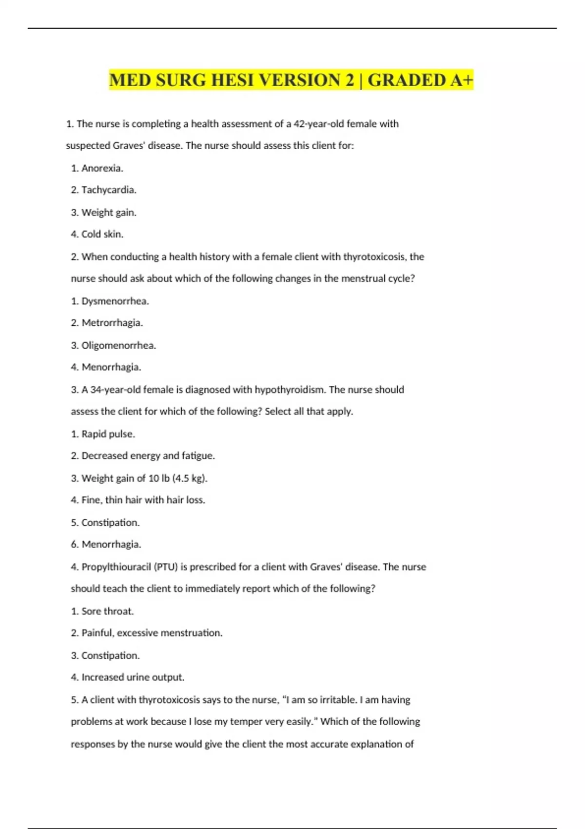 MED SURG HESI VERSION 2 | GRADED A+ 1. The nurse is completing a health assessment of a 42-year-old female with suspected Graves' disease. The nurse should assess this client for: 1. Anorexia. 2. Tachycardia. 3. Weight gain. 4. Cold skin. 2. When conducting a health history with a female client with thyrotoxicosis, the nurse should ask about which of the following changes in the menstrual cycle? 1. Dysmenorrhea. 2. Metrorrhagia. 3. Oligomenorrhea. 4. Menorrhagia. 3. A 34-year-old female is diagnosed with hypothyroidism. The nurse should assess the client for which of the following? Select all that apply. 1. Rapid pulse. 2. Decreased energy and fatigue. 3. Weight gain of 10 lb (4.5 kg). 4. Fine, thin hair with hair loss. 5. Constipation. 6. Menorrhagia. 4. Propylthiouracil (PTU) is prescribed for a client with Graves' disease. The nurse should teach the client to immediately report which of the following? 1. Sore throat. 2. Painful, excessive menstruation. 3. Constipation. 4. Increased urine output. 5. A client with thyrotoxicosis says to the nurse, “I am so irritable. I am having problems at work because I lose my temper very easily.” Which of the following responses by the nurse would give the client the most accurate explanation of her behavior? 1. “Your behavior is caused by temporary confusion brought on by your illness.” 2. “Your behavior is caused by the excess thyroid hormone in your system.” 3. “Your behavior is caused by your worrying about the seriousness of your illness.” 4. “Your behavior is caused by the stress of trying to manage a career and cope with illness.” 6. The nurse is evaluating a client with hyperthyroidism who is taking Propylthiouracil (PTU) 100 mg/day in three divided doses for maintenance therapy. Which of the following statements from the client indicates the desired outcome of the drug? 1. “I have excess energy throughout the day.” 2. “I am able to sleep and rest at night.” 3. “I have lost weight since taking this medication.” 4. “I do perspire throughout the entire day.” 7. The nurse should teach the client with Graves' disease to prevent corneal irritation from mild exophthalmos by: 1. Massaging the eyes at regular intervals. 2. Instilling an ophthalmic anesthetic as prescribed. 3. Wearing dark-colored glasses. 4. Covering both eyes with moistened gauze pads. 8. A client with Graves' disease is treated with radioactive iodine (RAI) in the form of sodium iodide 131I. Which of the following statements by the nurse will explain to the client how the drug works? 1. “The RAI stabilizes the thyroid hormone levels before a thyroidectomy.” 2. “The RAI reduces uptake of thyroxine and thereby improves your condition.” 3. “The RAI lowers the levels of thyroid hormones by slowing your body's production of them.” 4. “The RAI destroys thyroid tissue so that thyroid hormones are no longer produced.” 9. After treatment with radioactive iodine (RAI) in the form of sodium iodide 131I, the nurse teaches the client to: 1. Monitor for signs and symptoms of hyperthyroidism. 2. Rest for 1 week to prevent complications of the medication. 3. Take thyroxine replacement for the remainder of the client's life. 4. Assess for hypertension and tachycardia resulting from altered thyroid activity. 10. A client with a large goiter is scheduled for a subtotal thyroidectomy to treat thyrotoxicosis. Saturated solution of potassium iodide (SSKI) is prescribed preoperatively for the client. The expected outcome of using this drug is that it helps: 1. Slow progression of exophthalmos. 2. Reduce the vascularity of the thyroid gland. 3. Decrease the body's ability to store thyroxine. 4. Increase the body's ability to excrete thyroxine. 11. The nurse is administering a saturated solution of potassium iodide (SSKI). The 11. The nurse is administering a saturated solution of potassium iodide (SSKI). The nurse should: 1. Pour the solution over ice chips. 2. Mix the solution with an antacid. 3. Dilute the solution with water, milk, or fruit juice and have the client drink it with a straw. 4. Disguise the solution in a pureed fruit or vegetable. 12. Following a subtotal thyroidectomy, the nurse asks the client to speak immediately upon regaining consciousness. The nurse does this to monitor for signs of which of the following? 1. Internal hemorrhage. 2. Decreasing level of consciousness. 3. Laryngeal nerve damage. 4. Upper airway obstruction. 13. A client who has undergone a subtotal thyroidectomy is subject to complications in the first 48 hours after surgery. The nurse should obtain and keep at the bedside equipment to: 1. Begin total parenteral nutrition. 2. Start a cutdown infusion. 3. Administer tube feedings. 4. Perform a tracheotomy. 14. One day following a subtotal thyroidectomy, a client begins to have tingling in the fingers and toes. The nurse should first: 1. Encourage the client to flex and extend the fingers and toes. 2. Notify the physician. 3. Assess the client for thrombophlebitis. 4. Ask the client to speak. 15. Which of the following medications should be available to provide emergency treatment if a client develops tetany after a subtotal thyroidectomy? 1. Sodium phosphate. 2. Calcium gluconate. 3. Echothiophate iodide. 4. Sodium bicarbonate. 16. A 60-year-old female is diagnosed with hypothyroidism. The nurse should assess the client for which of the following? 1. Tachycardia. 2. Weight gain. 3. Diarrhea. 4. Nausea. 17. The nurse should assess a client with hypothyroidism for which of the following? 1. Corneal abrasion due to inability to close the eyelids. 2. Weight loss due to hypermetabolism. 3. Fluid loss due to diarrhea. 4. Decreased activity due to fatigue. 18. When discussing recent onset of feelings of sadness and depression in a client with hypothyroidism, the nurse should inform the client that these feelings are: 1. The effects of thyroid hormone replacement therapy and will diminish over time. 2. Related to thyroid hor