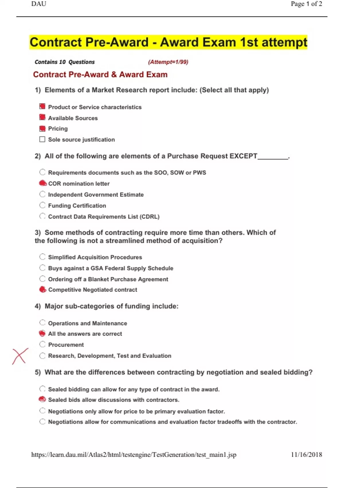 Contract Pre-Award - Award Exam 1st attempt Contains 10 Questions (Attempt=1/99) Contract Pre-Award & Award Exam 1) Elements of a Market Research report include: (Select all that apply) Product or Service characteristics Available Sources Pricing Sole source justification 2) All of the following are elements of a Purchase Request EXCEPT . Requirements documents such as the SOO, SOW or PWS COR nomination letter Independent Government Estimate Funding Certification Contract Data Requirements List (CDRL) 3) Some methods of contracting require more time than others. Which of the following is not a streamlined method of acquisition? Simplified Acquisition Procedures Buys against a GSA Federal Supply Schedule Ordering off a Blanket Purchase Agreement Competitive Negotiated contract 4) Major sub-categories of funding include: Operations and Maintenance All the answers are correct Procurement Research, Development, Test and Evaluation 5) What are the differences between contracting by negotiation and sealed bidding? Sealed bidding can allow for any type of contract in the award. Sealed bids allow discussions with contractors. Negotiations only allow for price to be primary evaluation factor. Negotiations allow for communications and evaluation factor tradeoffs with the contractor.