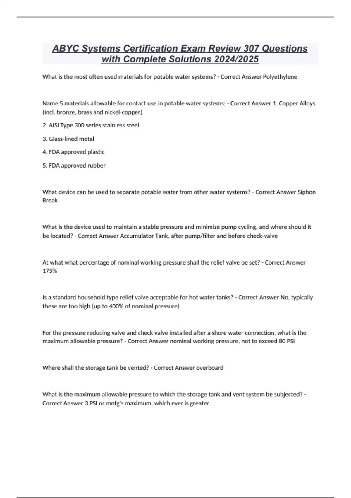 ABYC Systems Certification Exam Review 307 Questions with Complete Solutions 2024/2025 What is the most often used materials for potable water systems? - Correct Answer Polyethylene Name 5 materials allowable for contact use in potable water systems: - Correct Answer 1. Copper Alloys (incl. bronze, brass and nickel-copper) 2. AISI Type 300 series stainless steel 3. Glass-lined metal 4. FDA approved plastic 5. FDA approved rubber What device can be used to separate potable water from other water systems? - Correct Answer Siphon Break What is the device used to maintain a stable pressure and minimize pump cycling, and where should it be located? - Correct Answer Accumulator Tank, after pump/filter and before check-valve At what what percentage of nominal working pressure shall the relief valve be set? - Correct Answer 175% Is a standard household type relief valve acceptable for hot water tanks? - Correct Answer No, typically these are too high (up to 400% of nominal pressure) For the pressure reducing valve and check valve installed after a shore water connection, what is the maximum allowable pressure? - Correct Answer nominal working pressure, not to exceed 80 PSI Where shall the storage tank be vented? - Correct Answer overboard What is the maximum allowable pressure to which the storage tank and vent system be subjected? - Correct Answer 3 PSI or mnfg's maximum, which ever is greater.