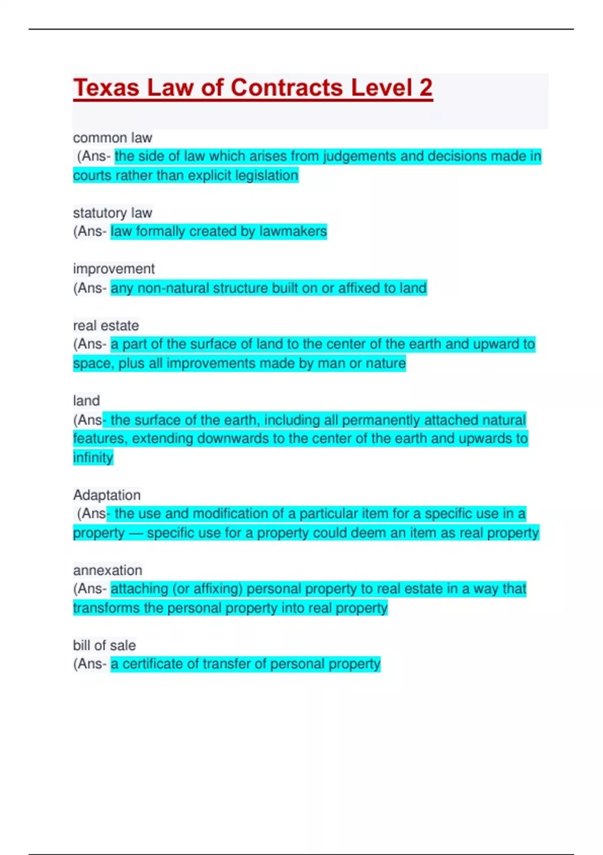 common law (Ans- the side of law which arises from judgements and decisions made in courts rather than explicit legislation statutory law (Ans- law formally created by lawmakers improvement (Ans- any non-natural structure built on or affixed to land real estate (Ans- a part of the surface of land to the center of the earth and upward to space, plus all improvements made by man or nature land (Ans- the surface of the earth, including all permanently attached natural features, extending downwards to the center of the earth and upwards to infinity Adaptation (Ans- the use and modification of a particular item for a specific use in a property — specific use for a property could deem an item as real property annexation (Ans- attaching (or affixing) personal property to real estate in a way that transforms the personal property into real property bill of sale (Ans- a certificate of transfer of personal property