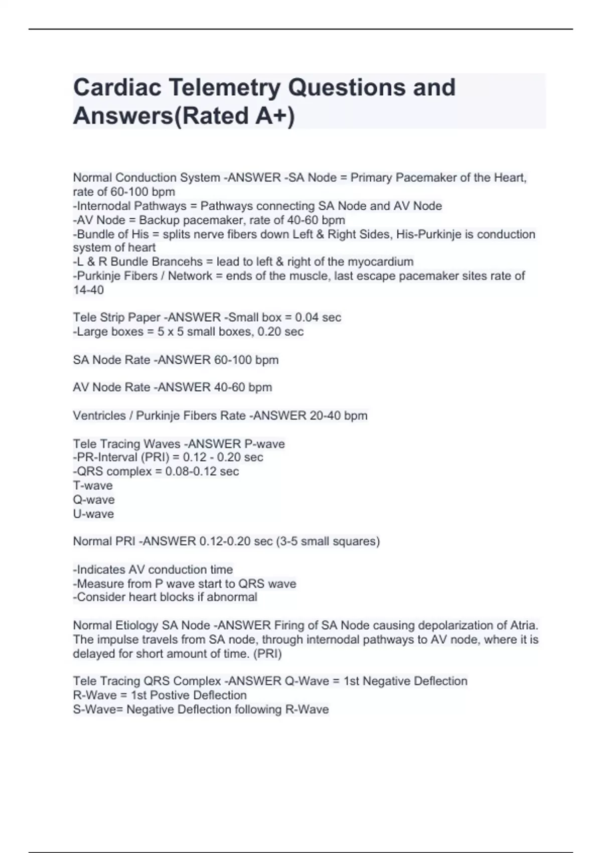Cardiac Telemetry Questions and Answers(Rate Normal Conduction System -ANSWER -SA Node = Primary Pacemaker of the Heart, rate of 60-100 bpm -Internodal Pathways = Pathways connecting SA Node and AV Node -AV Node = Backup pacemaker, rate of 40-60 bpm -Bundle of His = splits nerve fibers down Left & Right Sides, His-Purkinje is conduction system of heart -L & R Bundle Brancehs = lead to left & right of the myocardium -Purkinje Fibers / Network = ends of the muscle, last escape pacemaker sites rate of 14-40 Tele Strip Paper -ANSWER -Small box = 0.04 sec -Large boxes = 5 x 5 small boxes, 0.20 sec SA Node Rate -ANSWER 60-100 bpm AV Node Rate -ANSWER 40-60 bpm Ventricles / Purkinje Fibers Rate -ANSWER 20-40 bpm Tele Tracing Waves -ANSWER P-wave -PR-Interval (PRI) = 0.12 - 0.20 sec -QRS complex = 0.08-0.12 sec T-wave Q-wave U-wave Normal PRI -ANSWER 0.12-0.20 sec (3-5 small squares) -Indicates AV conduction time -Measure from P wave start to QRS wave -Consider heart blocks if abnormal Normal Etiology SA Node -ANSWER Firing of SA Node causing depolarization of Atria. The impulse travels from SA node, through internodal pathways to AV node, where it is delayed for short amount of time. (PRI) Tele Tracing QRS Complex -ANSWER Q-Wave = 1st Negative Deflection R-Wave = 1st Postive Deflection S-Wave= Negative Deflection following R-Wave d A+)