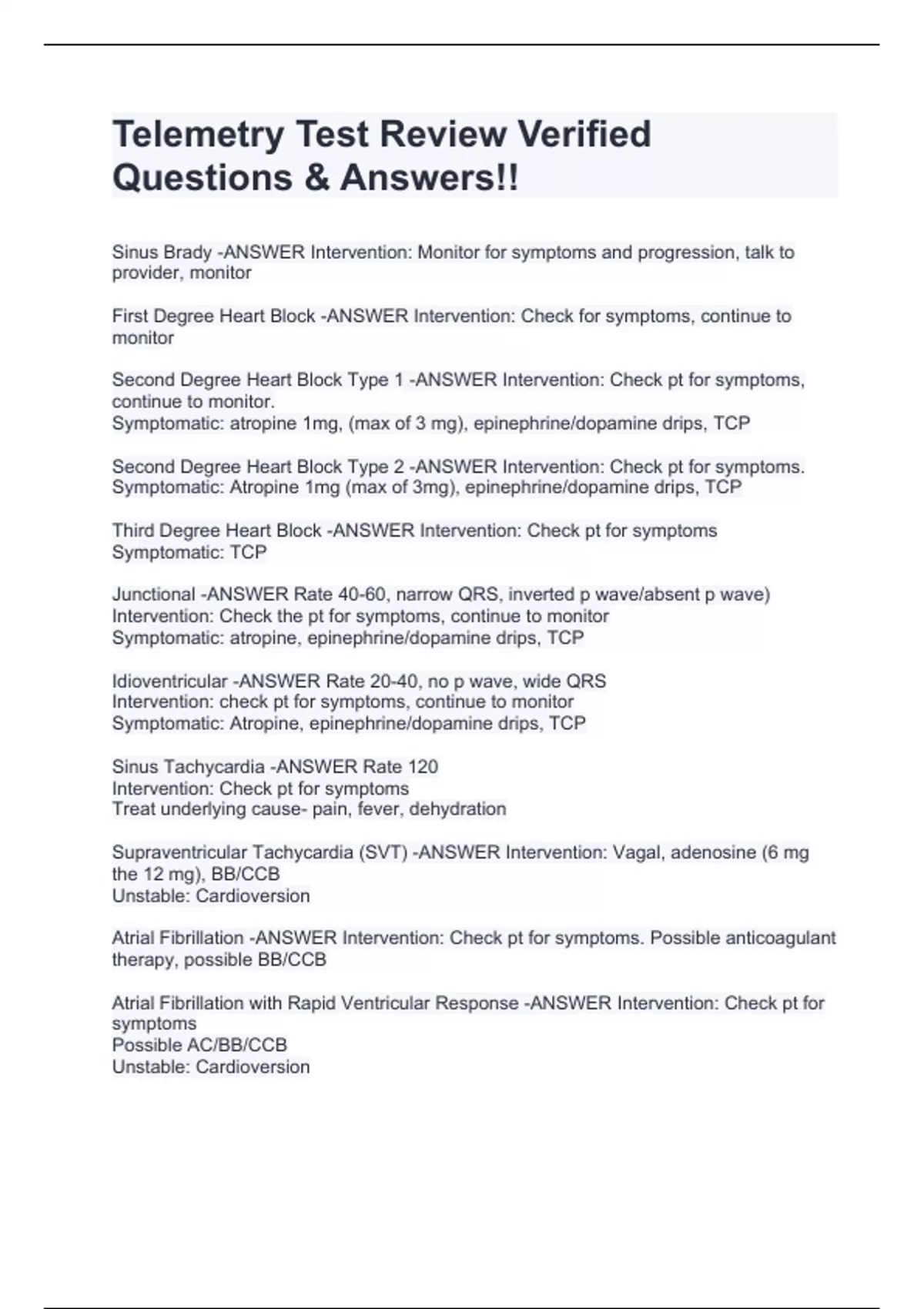 Telemetry Test Review Verified Questions & Sinus Brady -ANSWER Intervention: Monitor for symptoms and progression, talk to provider, monitor First Degree Heart Block -ANSWER Intervention: Check for symptoms, continue to monitor Second Degree Heart Block Type 1 -ANSWER Intervention: Check pt for symptoms, continue to monitor. Symptomatic: atropine 1mg, (max of 3 mg), epinephrine/dopamine drips, TCP Second Degree Heart Block Type 2 -ANSWER Intervention: Check pt for symptoms. Symptomatic: Atropine 1mg (max of 3mg), epinephrine/dopamine drips, TCP Third Degree Heart Block -ANSWER Intervention: Check pt for symptoms Symptomatic: TCP Junctional -ANSWER Rate 40-60, narrow QRS, inverted p wave/absent p wave) Intervention: Check the pt for symptoms, continue to monitor Symptomatic: atropine, epinephrine/dopamine drips, TCP Answers!!