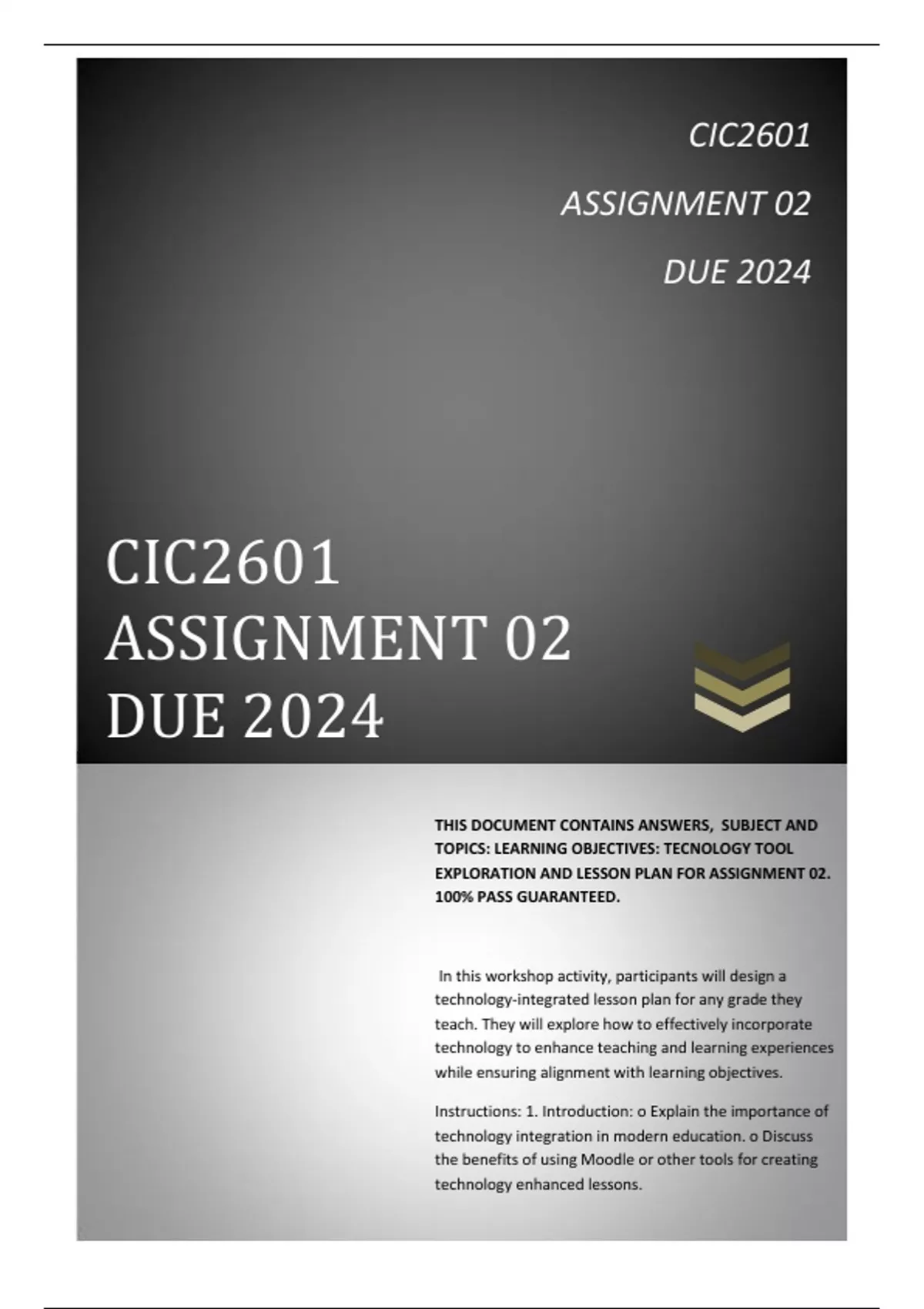 CIC2601 Assignment 02 Semester 1 2024. THIS DOCUMENT CONTAINS ANSWERS, SUBJECT AND TOPICS: LEARNING OBJECTIVES: TECHNOLOGY TOOL EXPLORATION AND LESSON PLAN FOR ASSIGNMENT 02. 100% PASS GUARANTEED. In this workshop activity, participants will design a technology-integrated lesson plan for any grade they teach. They will explore how to effectively incorporate technology to enhance teaching and learning experiences while ensuring alignment with learning objectives. Instructions: 1.... Introduction: Explain the importance of technology integration in modern education. o Discuss the benefits of using Moodle or other tools for creating technologyenhanced lessons.