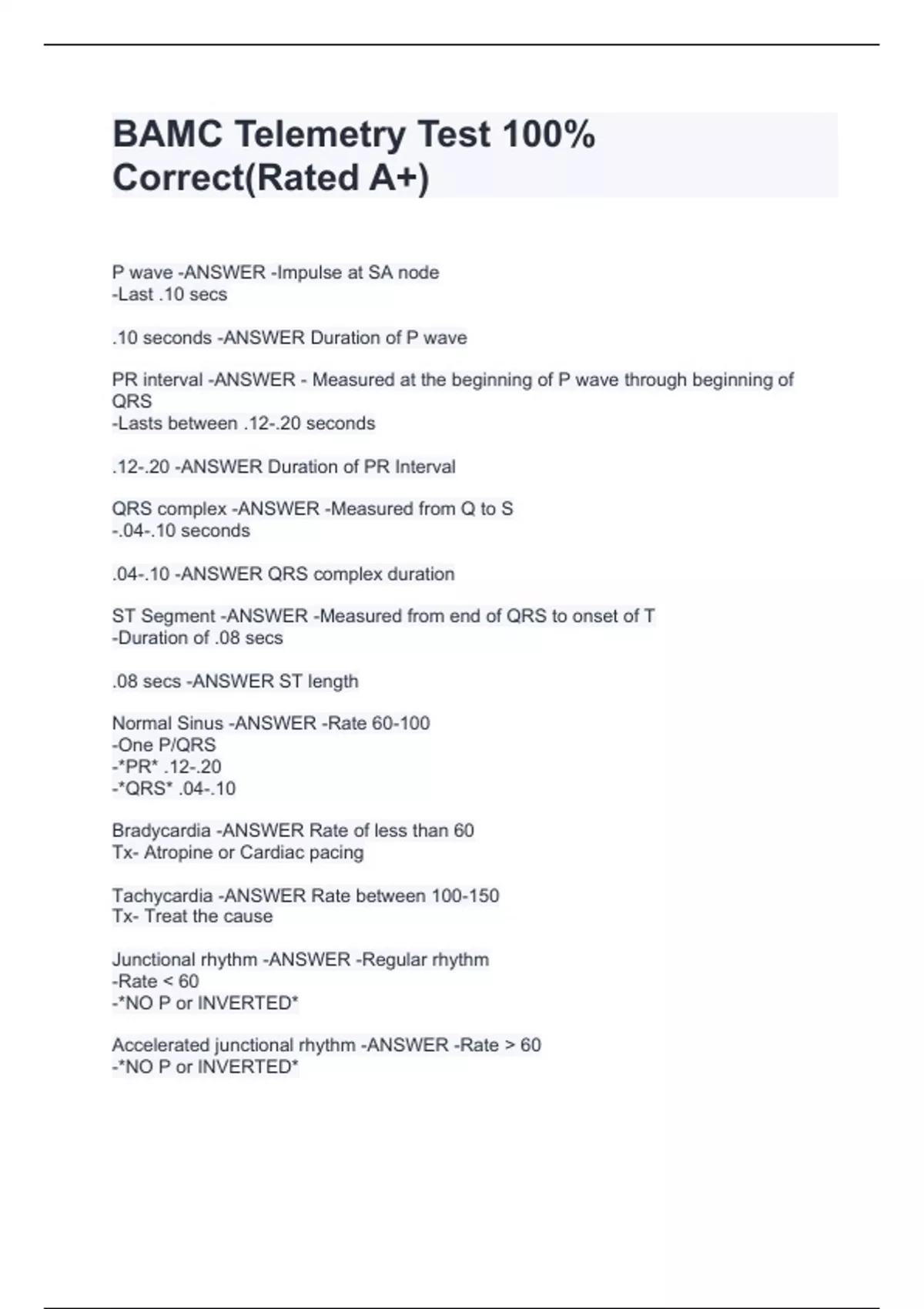 BAMC Telemetry Test 100% Correct(Rated A+)P wave -ANSWER -Impulse at SA node -Last .10 secs .10 seconds -ANSWER Duration of P wave PR interval -ANSWER - Measured at the beginning of P wave through beginning of QRS -Lasts between .12-.20 seconds .12-.20 -ANSWER Duration of PR Interval QRS complex -ANSWER -Measured from Q to S -.04-.10 seconds .04-.10 -ANSWER QRS complex duration ST Segment -ANSWER -Measured from end of QRS to onset of T -Duration of .08 secs