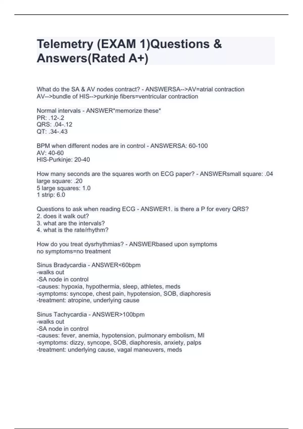 Telemetry (EXAM 1)Questions & Answers(Rated A+) What do the SA & AV nodes contract? - ANSWERSA-->AV=atrial contraction AV-->bundle of HIS-->purkinje fibers=ventricular contraction Normal intervals - ANSWER*memorize these* PR: .12-.2 QRS: .04-.12 QT: .34-.43 BPM when different nodes are in control - ANSWERSA: 60-100 AV: 40-60 HIS-Purkinje: 20-40 How many seconds are the squares worth on ECG paper? - ANSWERsmall square: .04 large square: .20 5 large squares: 1.0 1 strip: 6.0 Questions to ask when reading ECG - ANSWER1. is there a P for every QRS? 2. does it walk out? 3. what are the intervals? 4. what is the rate/rhythm? How do you treat dysrhythmias? - ANSWERbased upon symptoms no symptoms=no treatment Sinus Bradycardia - ANSWER<60bpm -walks out -SA node in control -causes: hypoxia, hypothermia, sleep, athletes, meds -symptoms: syncope, chest pain, hypotension, SOB, diaphoresis -treatment: atropine, underlying cause