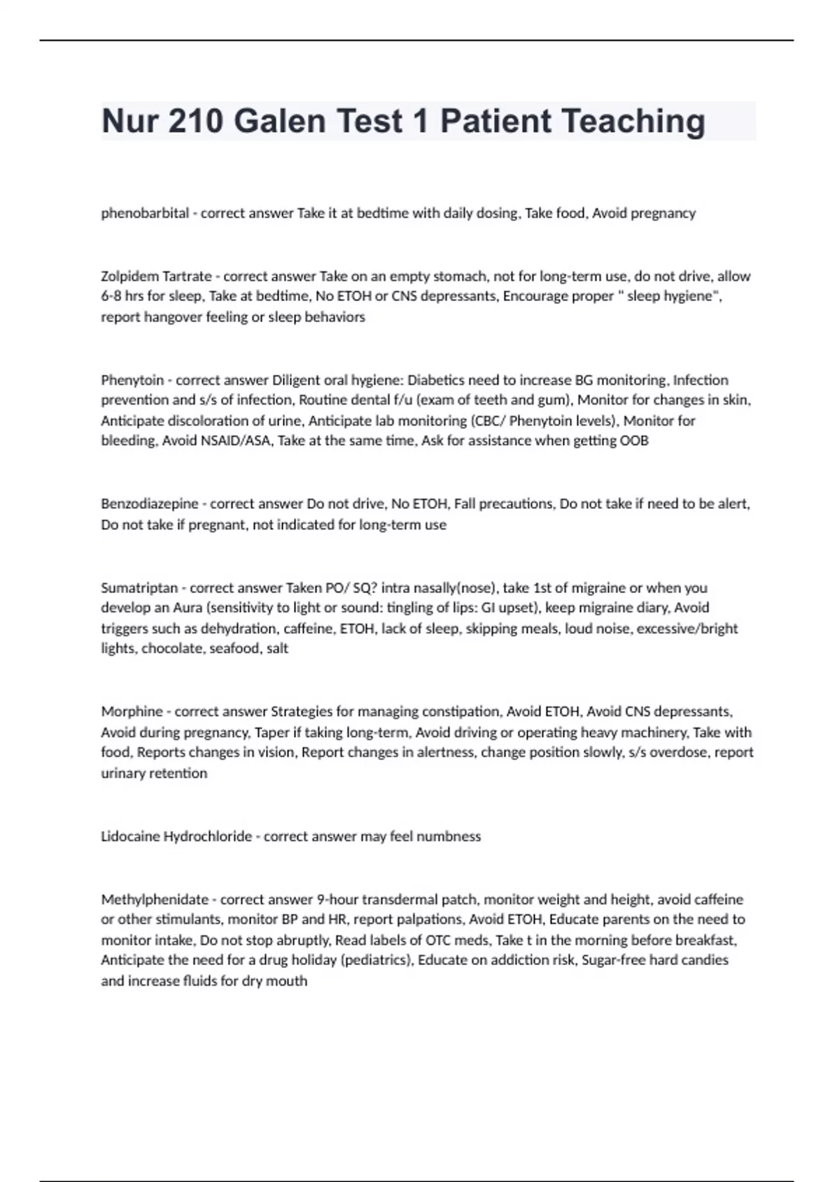 Nur 210 Galen Test 1 Patient Teachingphenobarbital - correct answer Take it at bedtime with daily dosing, Take food, Avoid pregnancy Zolpidem Tartrate - correct answer Take on an empty stomach, not for long-term use, do not drive, allow 6-8 hrs for sleep, Take at bedtime, No ETOH or CNS depressants, Encourage proper " sleep hygiene", report hangover feeling or sleep behaviors Phenytoin - correct answer Diligent oral hygiene: Diabetics need to increase BG monitoring, Infection prevention and s/s of infection, Routine dental f/u (exam of teeth and gum), Monitor for changes in skin, Anticipate discoloration of urine, Anticipate lab monitoring (CBC/ Phenytoin levels), Monitor for bleeding, Avoid NSAID/ASA, Take at the same time, Ask for assistance when getting OOB Benzodiazepine - correct answer Do not drive, No ETOH, Fall precautions, Do not take if need to be alert, Do not take if pregnant, not indicated for long-term use Sumatriptan - correct answer Taken PO/ SQ? intra nasally(nose), take 1st of migraine or when you develop an Aura (sensitivity to light or sound: tingling of lips: GI upset), keep migraine diary, Avoid triggers such as dehydration, caffeine, ETOH, lack of sleep, skipping meals, loud noise, excessive/bright lights, chocolate, seafood, salt Morphine - correct answer Strategies for managing constipation, Avoid ETOH, Avoid CNS depressants, Avoid during pregnancy, Taper if taking long-term, Avoid driving or operating heavy machinery, Take with food, Reports changes in vision, Report changes in alertness, change position slowly, s/s overdose, report urinary retention Lidocaine Hydrochloride - correct answer may feel numbness Methylphenidate - correct answer 9-hour transdermal patch, monitor weight and height, avoid caffeine or other stimulants, monitor BP and HR, report palpations, Avoid ETOH, Educate parents on the need to monitor intake, Do not stop abruptly, Read labels of OTC meds, Take t in the morning before breakfast, Anticipate the need for a drug holiday (pediatrics), Educate on addiction risk, Sugar-free hard candies and increase fluids for dry mouth