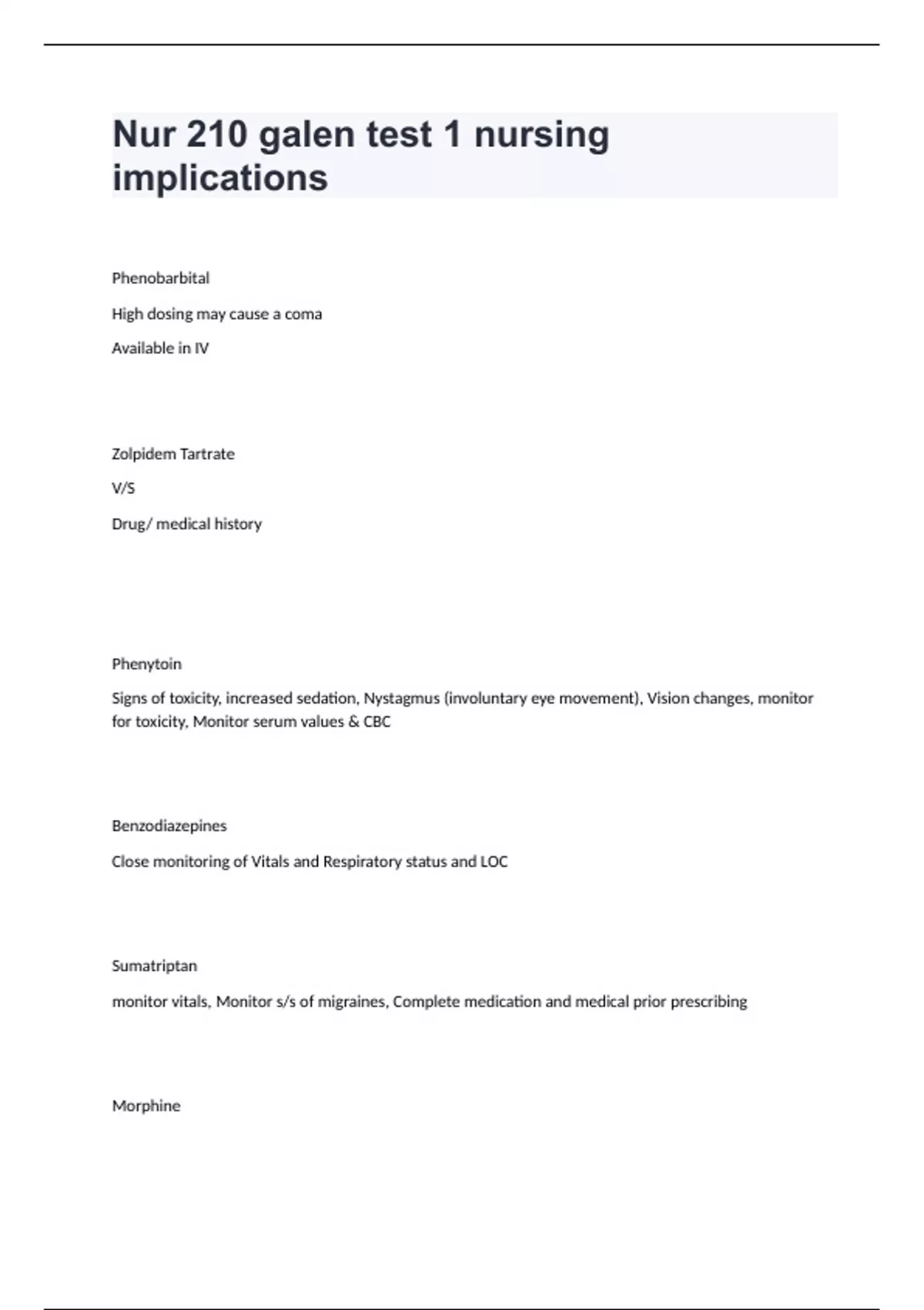 Nur 210 galen test 1 nursing implicationsPhenobarbital High dosing may cause a coma Available in IV Zolpidem Tartrate V/S Drug/ medical history Phenytoin Signs of toxicity, increased sedation, Nystagmus (involuntary eye movement), Vision changes, monitor for toxicity, Monitor serum values & CBC Benzodiazepines Close monitoring of Vitals and Respiratory status and LOC Sumatriptan monitor vitals, Monitor s/s of migraines, Complete medication and medical prior prescribing Morphine