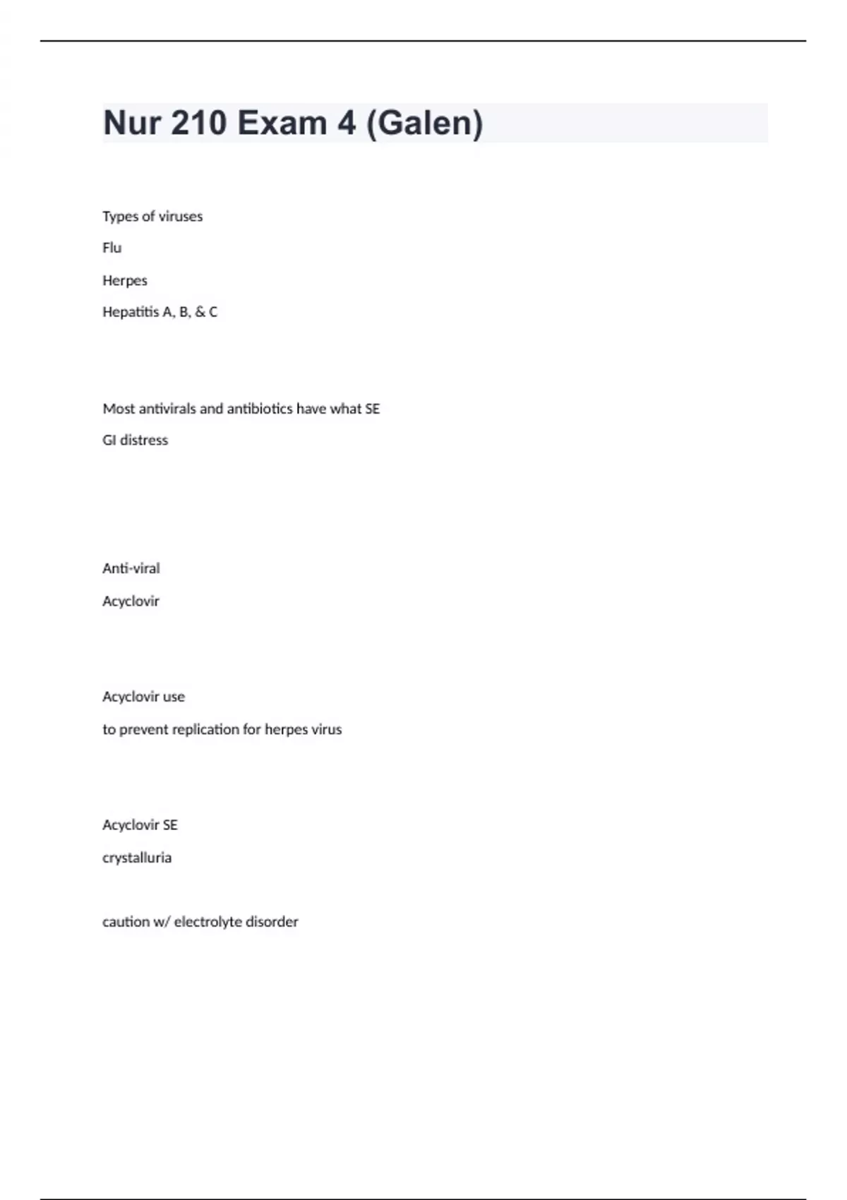 Nur 210 Exam 4 (Galen)Types of viruses Flu Herpes Hepatitis A, B, & C Most antivirals and antibiotics have what SE GI distress Anti-viral Acyclovir Acyclovir use to prevent replication for herpes virus Acyclovir SE crystalluria caution w/ electrolyte disorder
