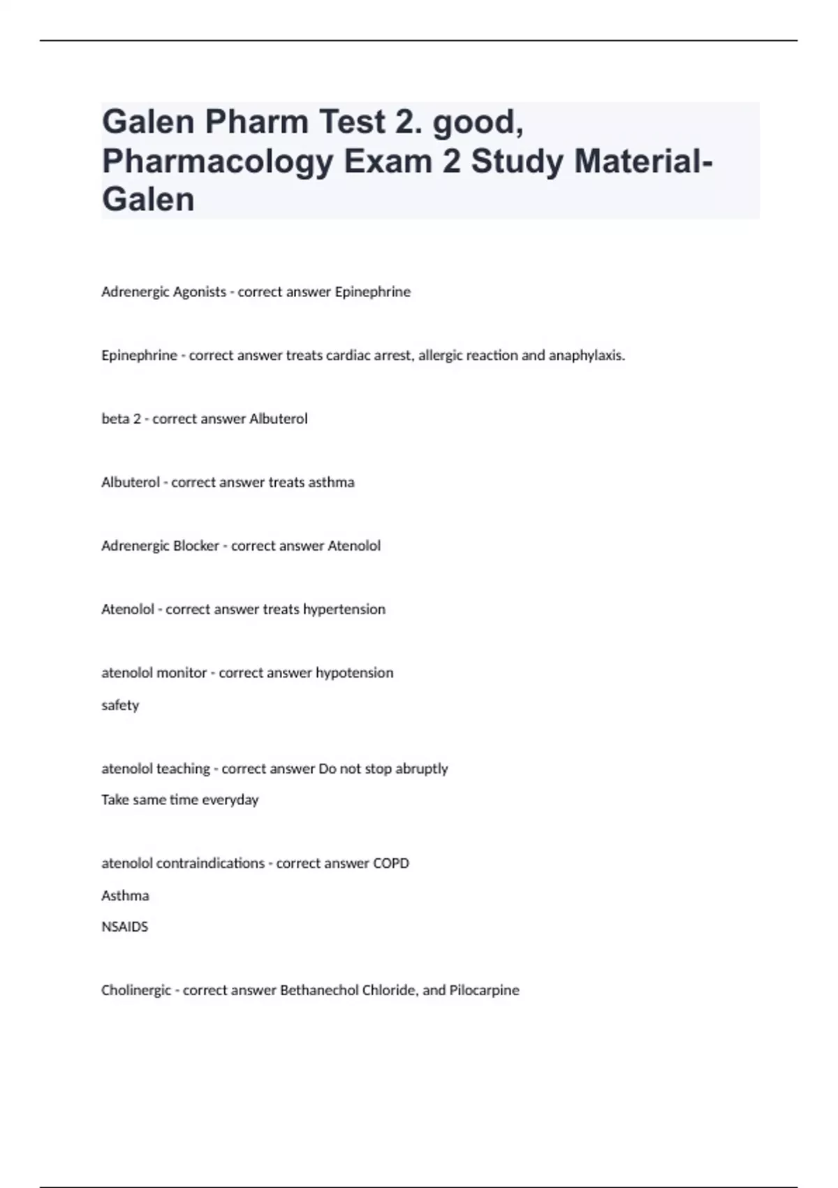 Galen Pharm Test 2. good, Pharmacology Exam 2 Study Material- GalenAdrenergic Agonists - correct answer Epinephrine Epinephrine - correct answer treats cardiac arrest, allergic reaction and anaphylaxis. beta 2 - correct answer Albuterol Albuterol - correct answer treats asthma Adrenergic Blocker - correct answer Atenolol Atenolol - correct answer treats hypertension atenolol monitor - correct answer hypotension safety atenolol teaching - correct answer Do not stop abruptly Take same time everyday atenolol contraindications - correct answer COPD Asthma NSAIDS Cholinergic - correct answer Bethanechol Chloride, and Pilocarpine