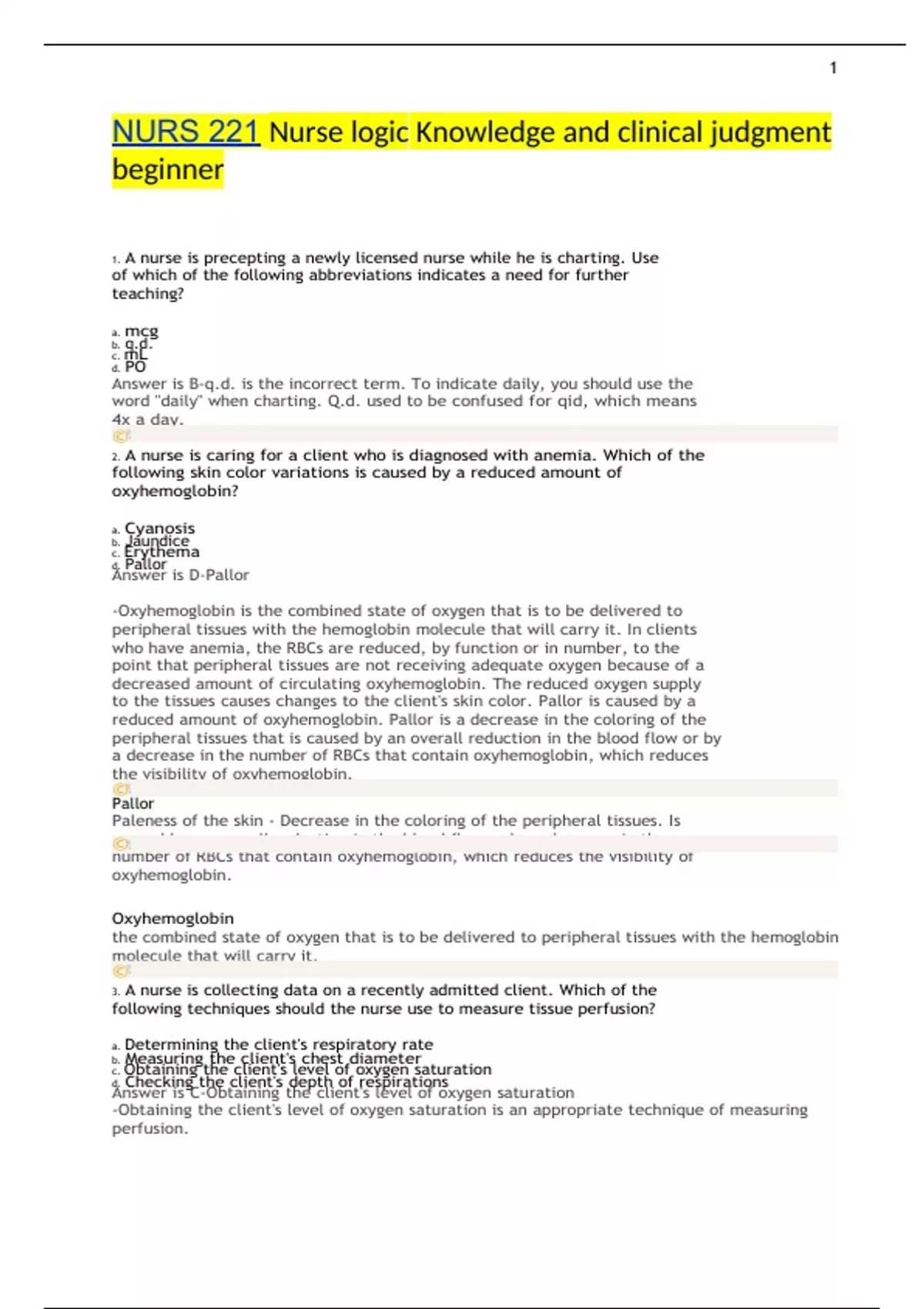 NURS 221 Nurse logic Knowledge and clinical judgment beginner 1. A nurse is precepting a newly licensed nurse while he is charting. Use of which of the following abbreviations indicates a need for further teaching? a. mcg b. q.d. c. mL d. PO Answer is B-q.d. is the incorrect term. To indicate daily, you should use the word "daily" when charting. Q.d. used to be confused for qid, which means 4x a day. 2. A nurse is caring for a client who is diagnosed with anemia. Which of the following skin color variations is caused by a reduced amount of oxyhemoglobin? a. Cyanosis b. Jaundice c. Erythema d. Pallor Answer is D-Pallor -Oxyhemoglobin is the combined state of oxygen that is to be delivered to peripheral tissues with the hemoglobin molecule that will carry it. In clients who have anemia, the RBCs are reduced, by function or in number, to the point that peripheral tissues are not receiving adequate oxygen because of a decreased amount of circulating oxyhemoglobin. The reduced oxygen supply to the tissues causes changes to the client's skin color. Pallor is caused by a reduced amount of oxyhemoglobin. Pallor is a decrease in the coloring of the peripheral tissues that is caused by an overall reduction in the blood flow or by a decrease in the number of RBCs that contain oxyhemoglobin, which reduces the visibility of oxyhemoglobin. Pallor Paleness of the skin - Decrease in the coloring of the peripheral tissues. Is caused by an overall reduction in the blood flow or by a decrease in the number of RBCs that contain oxyhemoglobin, which reduces the visibility of oxyhemoglobin. Oxyhemoglobin the combined state of oxygen that is to be delivered to peripheral tissues with the hemoglobin molecule that will carry it. 3. A nurse is collecting data on a recently admitted client. Which of the following techniques should the nurse use to measure tissue perfusion? a. Determining the client's respiratory rate b. Measuring the client's chest diameter c. Obtaining the client's level of oxygen saturation d. Checking the client's depth of respirations Answer is C-Obtaining the client's level of oxygen saturation -Obtaining the client's level of oxygen saturation is an appropriate technique of measuring perfusion. This item requires foundational thinking because you only need to identify which of the following options describes a technique for measuring tissue perfusion. Perfusion is the delivery or pumping of arterial blood through tissues or an organ. Oxygen saturation measures the percent of hemoglobin bound with oxygen that is being perfused through the arteries and into the tissues. Foundational Thinking Ability to recall and comprehend information and concepts Perfusion delivery or pumping of arterial blood through tissues or an organ. Oxygen saturation Measures the percent of hemoglobin bound with oxygen that is being perfused through the arteries and into the tissues. 4. A nurse is caring for a client who is prescribed IV fluids. While inserting the IV catheter, blood is spilled on the floor. Which of the following solutions should the nurse use to clean the spill? a. Isopropyl alcohol b. Chlorhexidine gluconate (Hibiclens) c. Chlorine (bleach) d. Iodophor Answer is C-Chlorine Chlorine is a disinfectant that is effective against bacteria, tuberculosis, spores, fungi, and viruses, and is specifically recommended for cleaning blood spills. Antiseptics prevent or stop the growth of certain pathogens, and disinfectants destroy certain pathogens. Antiseptics are most often used on the skin, while disinfectants are more concentrated solutions that can be toxic to the skin and are typically used on inanimate objects. Chlorine should be used to clean the spill. 5. A nurse is collecting nutritional data on an older adult client. Which of the following findings is suggestive of a healthy nutritional status? a. Spongy gums that are receding b. Fissures at eyelid corners c. Easily plucked hair d. reddish-colored tongue Answer is D-Reddish-colored tongue Deep reddish-colored tongue is suggestive of a healthy nutritional status. The tongue should be a healthy pink to a deep, reddish color with surface papillae present, without swelling or lesions. 6. A nurse is assisting with the preparation of an education program regarding advance directives for newly hired staff. Which of the following information should be included about living wills? a. Living wills require a written prescription from the provider to be legal. b. Living wills allow the client to designate a health care proxy. c. Living wills ensure hospitals provide emergency care regardless of health coverage. d. Living wills detail treatment wishes of the client in the event of terminal illness. Answer is D-Living wills detail treatment wishes of the client in the event of terminal illness. Advance directives include both living wills and durable powers of attorney for health care. The living will details treatment wishes of the client in the event of terminal illness or persistent vegetative state. This information is accurate and should be included in the teaching about living wills. Advance directives Include both living wills and durable powers of attorney for health care. Living Wills Details treatment wishes of the client in the event of terminal illness or persistent vegetative state. This information is accurate and should be included in the teaching about living wills. 7. A nurse is caring for a male client who has been prescribed an indwelling urinary catheter. In which of the following positions should the client be placed for insertion of the catheter? a. Dorsal recumbent b. Orthopneic c. Side-lying d. Supine Answer is D-Supine Indwelling urinary catheters are indicated in numerous situations, such as relief of bladder distension, strict measurement of urinary output, need for bladder irrigations, and surgery. A prescription from the provider is required for urethral catheterization. When preparing to implement this procedure, it is important to en