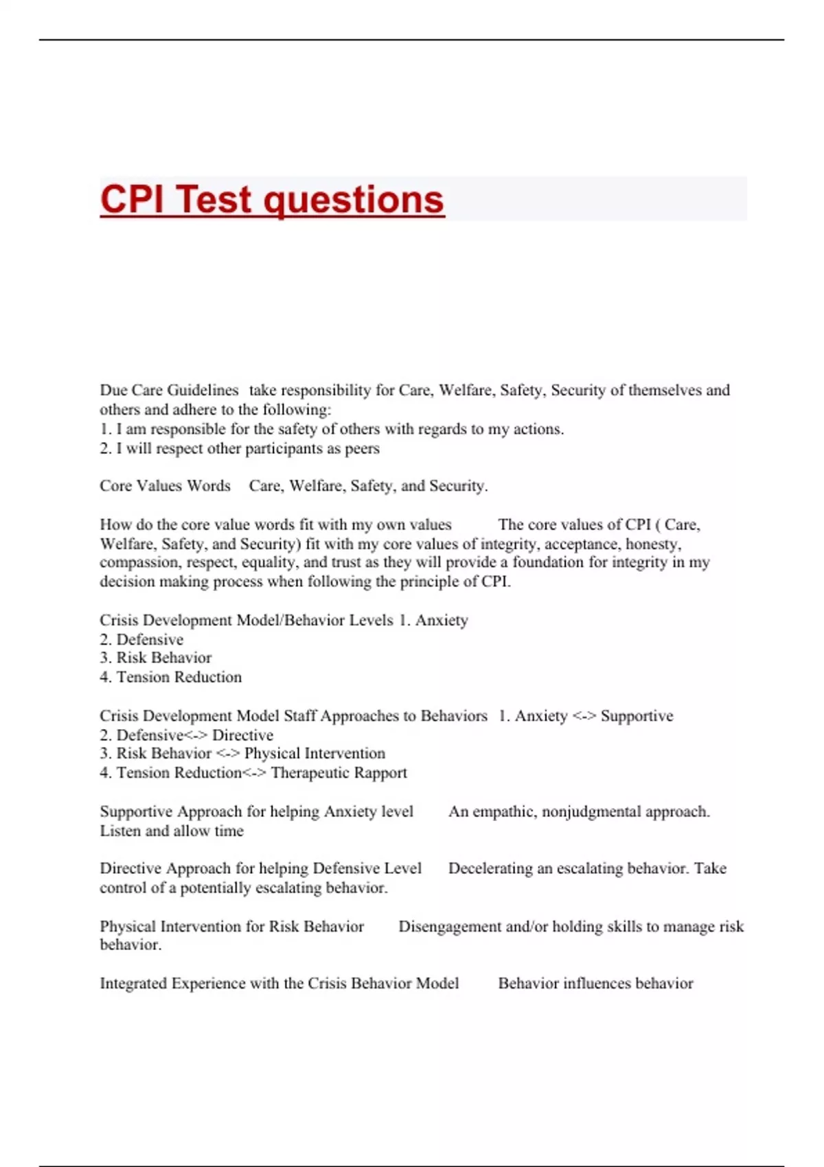 CPI Test questions Due Care Guidelines take responsibility for Care, Welfare, Safety, Security of themselves and others and adhere to the following: 1. I am responsible for the safety of others with regards to my actions. 2. I will respect other participants as peers Core Values Words Care, Welfare, Safety, and Security. How do the core value words fit with my own values The core values of CPI ( Care, Welfare, Safety, and Security) fit with my core values of integrity, acceptance, honesty, compassion, respect, equality, and trust as they will provide a foundation for integrity in my decision making process when following the principle of CPI. Crisis Development Model/Behavior Levels 1. Anxiety 2. Defensive 3. Risk Behavior 4. Tension Reduction Crisis Development Model Staff Approaches to Behaviors 1. Anxiety <-> Supportive 2. Defensive<-> Directive 3. Risk Behavior <-> Physical Intervention 4. Tension Reduction<-> Therapeutic Rapport Supportive Approach for helping Anxiety level An empathic, nonjudgmental approach. Listen and allow time Directive Approach for helping Defensive Level Decelerating an escalating behavior. Take control of a potentially escalating behavior. Physical Intervention for Risk Behavior Disengagement and/or holding skills to manage risk behavior. Integrated Experience with the Crisis Behavior Model Behavior influences behavior Nonverbal Communication PKH Proxemics Kinesics Haptics Proxemics personal space. Kinesics body language Haptics communication through touch Nonverbal Communication: Supportive Stance
