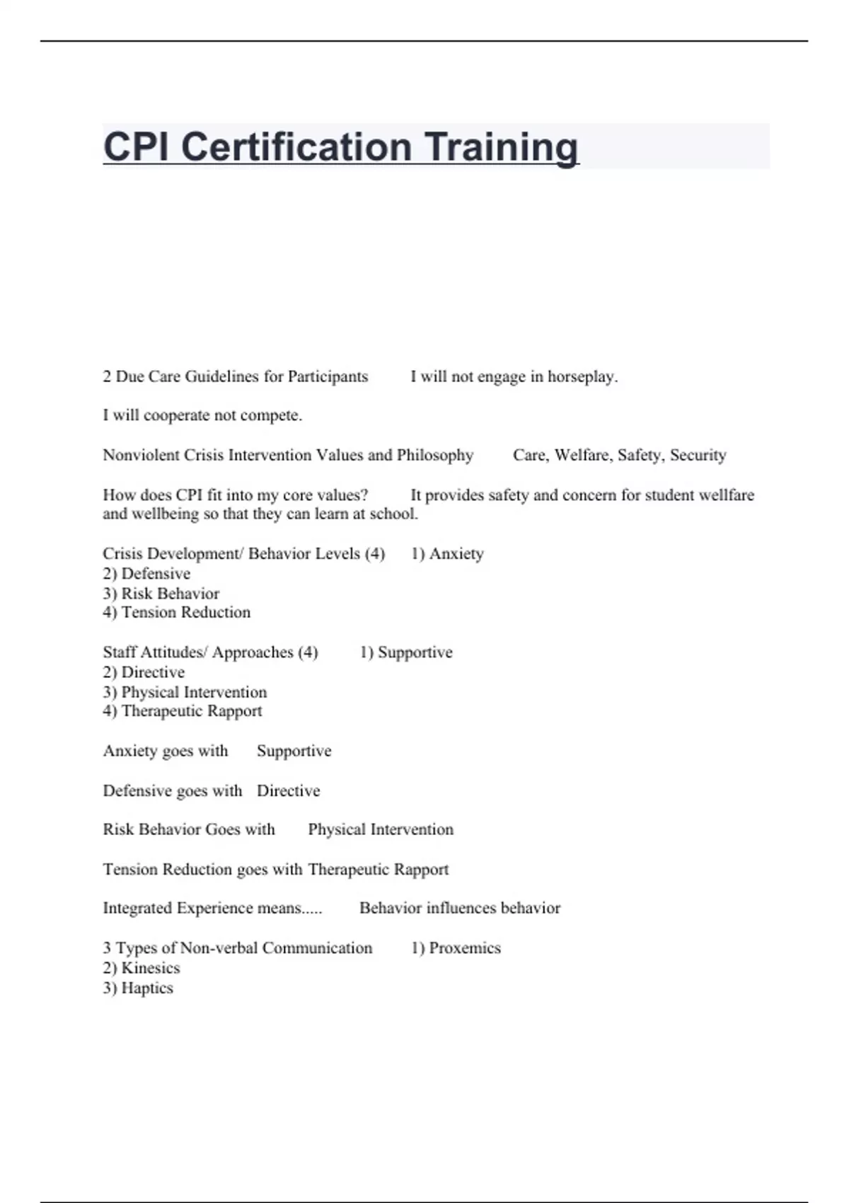 CPI Certification Training 2 Due Care Guidelines for Participants I will not engage in horseplay. I will cooperate not compete. Nonviolent Crisis Intervention Values and Philosophy Care, Welfare, Safety, Security How does CPI fit into my core values? It provides safety and concern for student wellfare and wellbeing so that they can learn at school. Crisis Development/ Behavior Levels (4) 1) Anxiety 2) Defensive 3) Risk Behavior 4) Tension Reduction Staff Attitudes/ Approaches (4) 1) Supportive 2) Directive 3) Physical Intervention 4) Therapeutic Rapport Anxiety goes with Supportive Defensive goes with Directive Risk Behavior Goes with Physical Intervention Tension Reduction goes with Therapeutic Rapport Integrated Experience means..... Behavior influences behavior