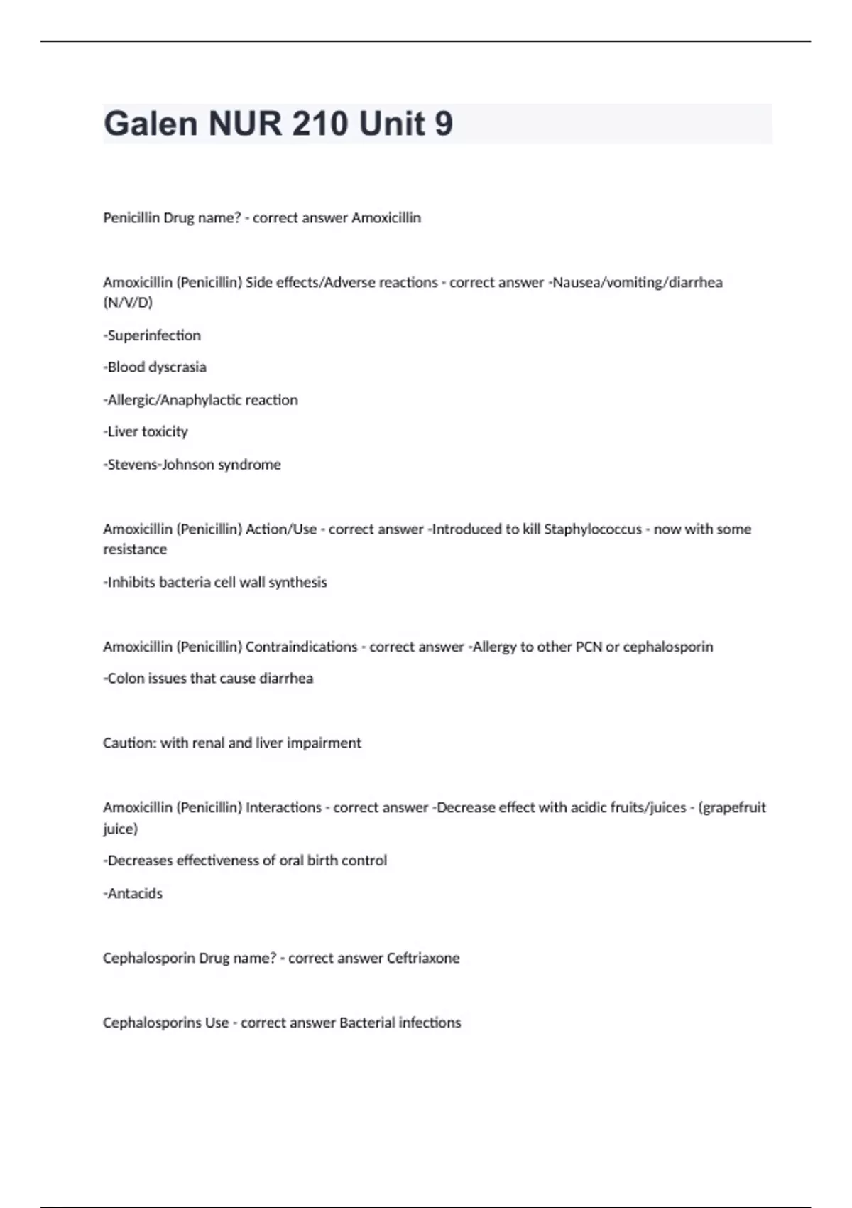 Galen NUR 210 Unit 9 fully solved graded A+Penicillin Drug name? - correct answer Amoxicillin Amoxicillin (Penicillin) Side effects/Adverse reactions - correct answer -Nausea/vomiting/diarrhea (N/V/D) -Superinfection -Blood dyscrasia -Allergic/Anaphylactic reaction -Liver toxicity -Stevens-Johnson syndrome Amoxicillin (Penicillin) Action/Use - correct answer -Introduced to kill Staphylococcus - now with some resistance -Inhibits bacteria cell wall synthesis Amoxicillin (Penicillin) Contraindications - correct answer -Allergy to other PCN or cephalosporin -Colon issues that cause diarrhea Caution: with renal and liver impairment Amoxicillin (Penicillin) Interactions - correct answer -Decrease effect with acidic fruits/juices - (grapefruit juice) -Decreases effectiveness of oral birth control -Antacids Cephalosporin Drug name? - correct answer Ceftriaxone Cephalosporins Use - correct answer Bacterial infections