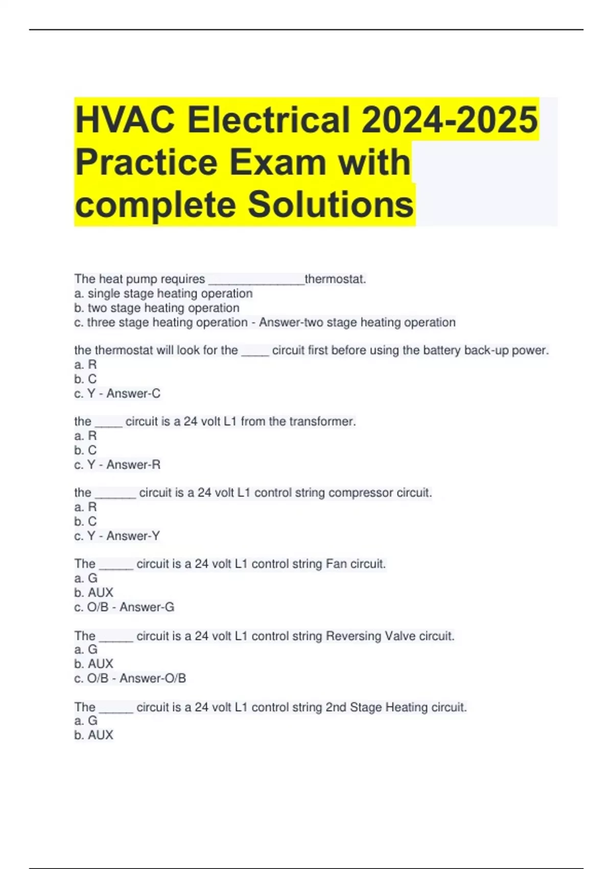 HVAC Electrical Practice Exam with complete Solutions The heat pump requires ______________thermostat. a. single stage heating operation b. two stage heating operation c. three stage heating operation - Answer-two stage heating operation the thermostat will look for the ____ circuit first before using the battery back-up power. a. R b. C c. Y - Answer-C the ____ circuit is a 24 volt L1 from the transformer. a. R b. C c. Y - Answer-R the ______ circuit is a 24 volt L1 control string compressor circuit. a. R b. C c. Y - Answer-Y The _____ circuit is a 24 volt L1 control string Fan circuit. a. G b. AUX c. O/B - Answer-G The _____ circuit is a 24 volt L1 control string Reversing Valve circuit. a. G b. AUX c. O/B - Answer-O/B