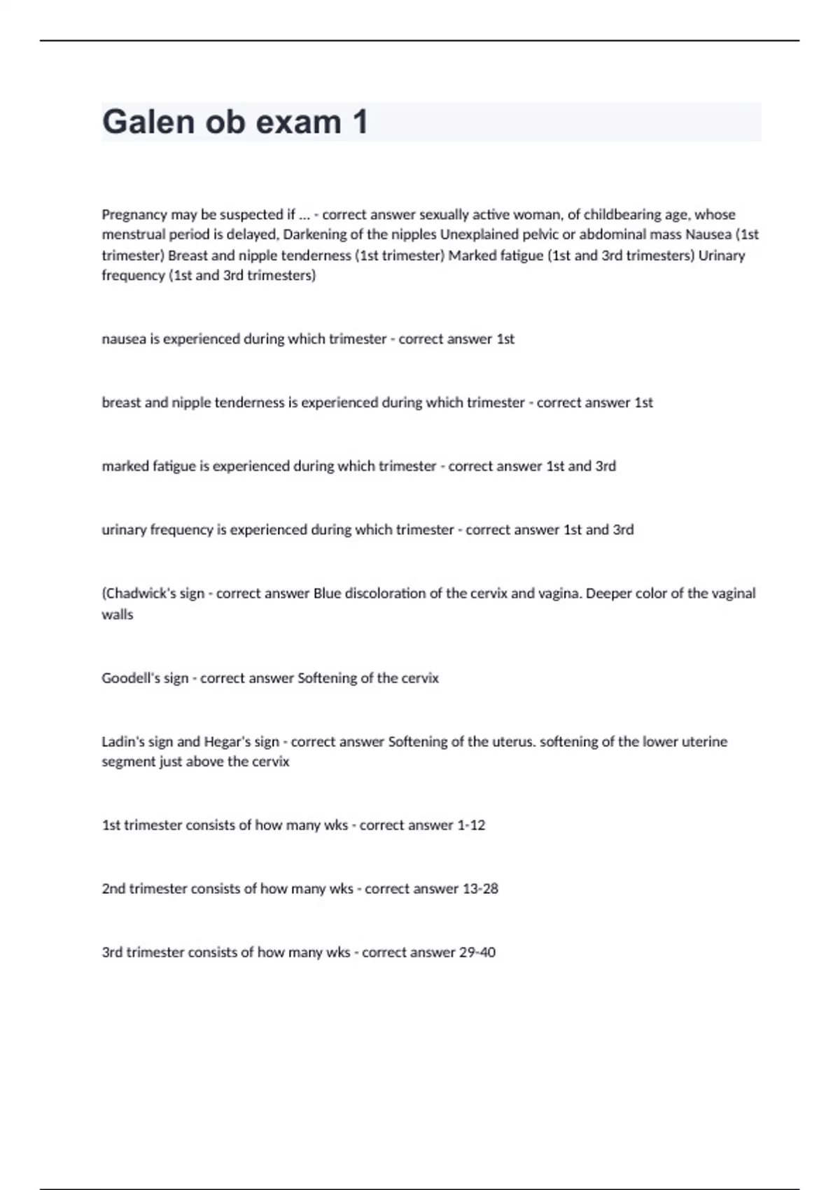 Galen ob exam 1 with complete solutions 2024/2025Pregnancy may be suspected if ... - correct answer sexually active woman, of childbearing age, whose menstrual period is delayed, Darkening of the nipples Unexplained pelvic or abdominal mass Nausea (1st trimester) Breast and nipple tenderness (1st trimester) Marked fatigue (1st and 3rd trimesters) Urinary frequency (1st and 3rd trimesters) nausea is experienced during which trimester - correct answer 1st breast and nipple tenderness is experienced during which trimester - correct answer 1st marked fatigue is experienced during which trimester - correct answer 1st and 3rd urinary frequency is experienced during which trimester - correct answer 1st and 3rd (Chadwick's sign - correct answer Blue discoloration of the cervix and vagina. Deeper color of the vaginal walls Goodell's sign - correct answer Softening of the cervix Ladin's sign and Hegar's sign - correct answer Softening of the uterus. softening of the lower uterine segment just above the cervix 1st trimester consists of how many wks - correct answer 1-12 2nd trimester consists of how many wks - correct answer 13-28 3rd trimester consists of how many wks - correct answer 29-40