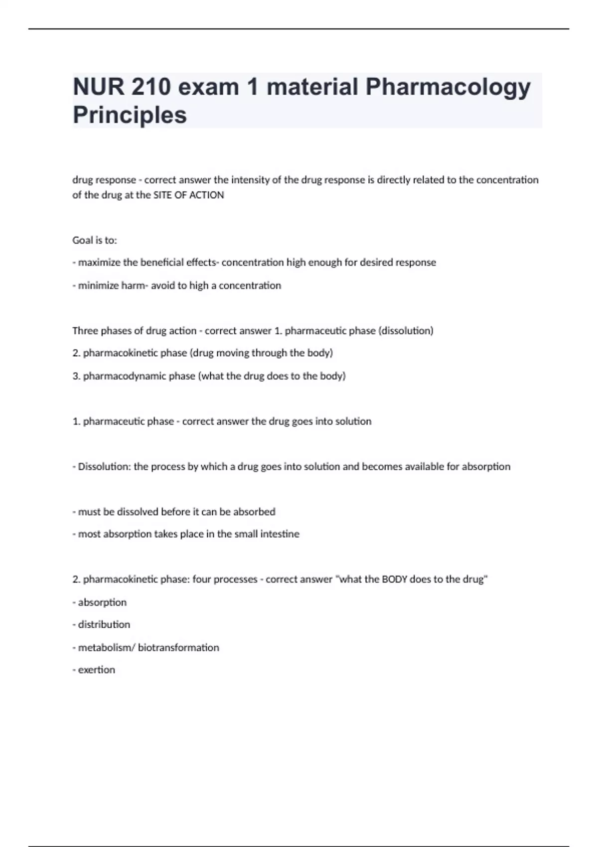NUR 210 exam 1 material Pharmacology Principles fully well solveddrug response - correct answer the intensity of the drug response is directly related to the concentration of the drug at the SITE OF ACTION Goal is to: - maximize the beneficial effects- concentration high enough for desired response - minimize harm- avoid to high a concentration Three phases of drug action - correct answer 1. pharmaceutic phase (dissolution) 2. pharmacokinetic phase (drug moving through the body) 3. pharmacodynamic phase (what the drug does to the body) 1. pharmaceutic phase - correct answer the drug goes into solution - Dissolution: the process by which a drug goes into solution and becomes available for absorption - must be dissolved before it can be absorbed - most absorption takes place in the small intestine 2. pharmacokinetic phase: four processes - correct answer "what the BODY does to the drug" - absorption - distribution - metabolism/ biotransformation - exertion pharmacokinetic phase: Absorption - correct answer (small intestine) the movement of a drug from its site of administration into the blood pharmacokinetic phase: Distribution - correct answer drug moves from blood --> cell membrane pharmacokinetic phase: Metabolism/biotransformation - correct answer lipid soluble metabolite (liver) --> a water soluble metabolite pharmacokinetic phase: Excretion - correct answer water soluble metabolite (kidneys) liver - correct answer breaks down the drug kidneys - correct answer excretes the drug Pharmacokinetic phase movement process - correct answer orally --> stomach --> SI --> bloodstream --> site of action --> liver (broken down) --> kidneys (excreted) IV --> bloodstream --> cite of action --> liver --> kidneys drugs crossing the cell membranes phospholipid cell layer - correct answer -drugs must be LIPID SOLUBLE in order to pass through the membrane - WATER SOLUBLE drugs penetrate the cell membrane through channels and pores Absorption 1. direct penetration of the membranes 2. channels and pores 3. transport systems - correct answer the movement of a drug from its site of administration to the blood