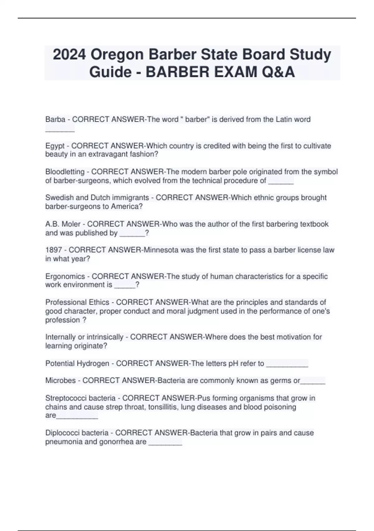 2024 Oregon Barber State Board Study Guide - BARBER EXAM Q&A Barba - CORRECT ANSWER-The word " barber" is derived from the Latin word _______ Egypt - CORRECT ANSWER-Which country is credited with being the first to cultivate beauty in an extravagant fashion? Bloodletting - CORRECT ANSWER-The modern barber pole originated from the symbol of barber-surgeons, which evolved from the technical procedure of ______ Swedish and Dutch immigrants - CORRECT ANSWER-Which ethnic groups brought barber-surgeons to America? A.B. Moler - CORRECT ANSWER-Who was the author of the first barbering textbook and was published by ______? 1897 - CORRECT ANSWER-Minnesota was the first state to pass a barber license law in what year? Ergonomics - CORRECT ANSWER-The study of human characteristics for a specific work environment is _____? Professional Ethics - CORRECT ANSWER-What are the principles and standards of good character, proper conduct and moral judgment used in the performance of one's profession ? Internally or intrinsically - CORRECT ANSWER-Where does the best motivation for learning originate? Potential Hydrogen - CORRECT ANSWER-The letters pH refer to __________ Microbes - CORRECT ANSWER-Bacteria are commonly known as germs or______ Streptococci bacteria - CORRECT ANSWER-Pus forming organisms that grow in chains and cause strep throat, tonsillitis, lung diseases and blood poisoning are__________ Diplococci bacteria - CORRECT ANSWER-Bacteria that grow in pairs and cause pneumonia and gonorrhea are ________ Flagella or cilia - CORRECT ANSWER-Hair-like projections that propel bacteria through liquids are called __________ Reproduce - CORRECT ANSWER-During the active stage, bacteria grow and ______ Forming Spores - CORRECT ANSWER-Some bacteria survive the inactive stage by ______ Soiled hands - CORRECT ANSWER-Diseases may be spread by _________ Viruses - CORRECT ANSWER-Disease producing organisms that live only by penetrating cells and becoming part of them are __________ Bloodborne pathogens - CORRECT ANSWER-Disease producing bacteria that are carried through the body and blood or body fluids are known as ______________ Plant parasite - CORRECT ANSWER-Ringworm is caused by a ____________ Decontamination - CORRECT ANSWER-The removal of pathogens from tools and services is known as ____________ Disinfection procedures - CORRECT ANSWER-State barber boards and health departments require sanitation and _________ Sterilization - CORRECT ANSWER-The highest LEVEL of decontamination is _________ 1:1000 - CORRECT ANSWER-For effective disinfection the minimum STRENGTH of a Quat solution used to sanitize implements is ____________ Safety - CORRECT ANSWER-OSHA regulates and enforces safety and health in the workplace by setting _______ standards. Manufacturer - CORRECT ANSWER-The responsibility for product safety rest with the _____________ each client - CORRECT ANSWER-Headrest covers must be changed for __________ Uniform pockets - CORRECT ANSWER-For sanitary reasons, combs and other implements should never be placed in __________ Harden the hair - CORRECT ANSWER-Mild acidic solutions contract or _______ Dry or powder formulations - CORRECT ANSWER-Shampoo categories include liquid, liquid-dry and ________ or ___________ Acid-balanced shampoos - CORRECT ANSWER-What type of shampoo is generally recommended for normal, chemically treated or fragile hair? Trichology - CORRECT ANSWER-The technical term for the study of the hair is _______ Amino acids - CORRECT ANSWER-Chemical UNITS that make up PROTEIN are _______ Peptide bonds - CORRECT ANSWER-Chemical BONDS that JOIN amino acids together are ________ Keratin - CORRECT ANSWER-Hair is chiefly composed of HORNY substance called _________ Hair Root - CORRECT ANSWER-That portion of the hair found BENEATH THE SKIN SURFACE is known as the _____________ Keratinization - CORRECT ANSWER-Hair cells MATURE IN THE FOLLICLE through a PROCESS known as ____________ Sulfur - CORRECT ANSWER-The ELEMENTS found in the human hair are Carbon (51%), Oxygen(21%), Hydrogen(17%), Nitrogen(6%), and (5%) _______ Chemical bonds - CORRECT ANSWER-End bonds are