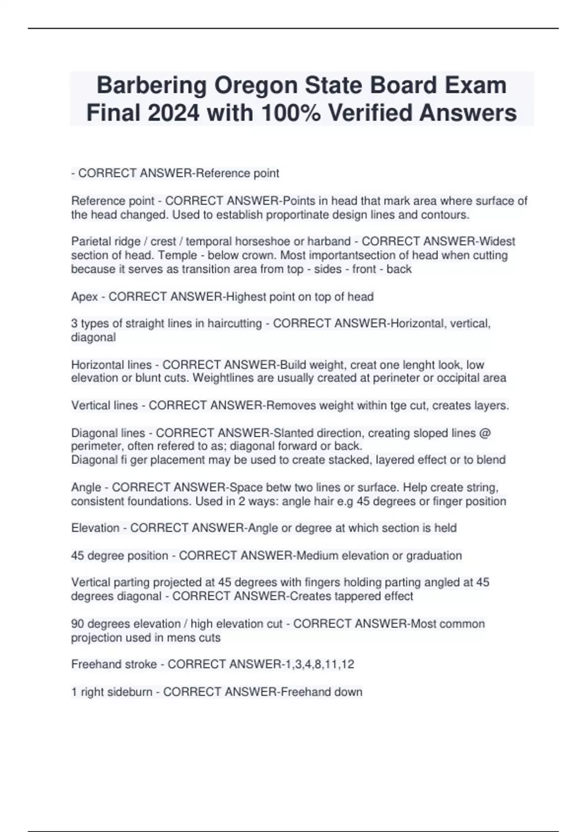 Barbering Oregon State Board Exam Final 2024 with 100% Verified Answers - CORRECT ANSWER-Reference point Reference point - CORRECT ANSWER-Points in head that mark area where surface of the head changed. Used to establish proportinate design lines and contours. Parietal ridge / crest / temporal horseshoe or harband - CORRECT ANSWER-Widest section of head. Temple - below crown. Most importantsection of head when cutting because it serves as transition area from top - sides - front - back Apex - CORRECT ANSWER-Highest point on top of head 3 types of straight lines in haircutting - CORRECT ANSWER-Horizontal, vertical, diagonal Horizontal lines - CORRECT ANSWER-Build weight, creat one lenght look, low elevation or blunt cuts. Weightlines are usually created at perineter or occipital area Vertical lines - CORRECT ANSWER-Removes weight within tge cut, creates layers. Diagonal lines - CORRECT ANSWER-Slanted direction, creating sloped lines @ perimeter, often refered to as; diagonal forward or back. Diagonal fi ger placement may be used to create stacked, layered effect or to blend Angle - CORRECT ANSWER-Space betw two lines or surface. Help create string, consistent foundations. Used in 2 ways: angle hair e.g 45 degrees or finger position Elevation - CORRECT ANSWER-Angle or degree at which section is held 45 degree position - CORRECT ANSWER-Medium elevation or graduation Vertical parting projected at 45 degrees with fingers holding parting angled at 45 degrees diagonal - CORRECT ANSWER-Creates tappered effect 90 degrees elevation / high elevation cut - CORRECT ANSWER-Most common projection used in mens cuts Freehand stroke - CORRECT ANSWER-1,3,4,8,11,12 1 right sideburn - CORRECT ANSWER-Freehand down 2 rrightcheek - CORRECT ANSWER-Backhand down 3 right upper lip - CORRECT ANSWER-Freehand down 4 right side below jaw - CORRECT ANSWER-Freehand down 5 right side of neck - CORRECT ANSWER-Reversed freehand up 6 left upper lip - CORRECT ANSWER-Backhand down 7 left sideburn - CORRECT ANSWER-Backhand down 8 left side of cheek - CORRECT ANSWER-Freehand down 9 left side below jaw - CORRECT ANSWER-Backhand down 10 left side of neck - CORRECT ANSWER-Reversed freehand up 11 across chin - CORRECT ANSWER-Freehand across 12 below chin - CORRECT ANSWER-Free or backhand down 13 middle of neck - CORRECT ANSWER-Reversed freehand up 14 lower lip - CORRECT ANSWER-Reversed freehand up A parting - CORRECT ANSWER-Small section of hair 1/4" to 1/2" Cutting line - CORRECT ANSWER-Position of fingers when cutting a section of hair Design line - CORRECT ANSWER-Outer perimeter line of haircut Stationary guide - CORRECT ANSWER-Overall one length looking design Traveling guide - CORRECT ANSWER-Moves along a section of hair as each cut is made Weightline - CORRECT ANSWER-Heaviest perimeter area of 0-45• cut Maximum tension - CORRECT ANSWER-On straight hair to create precise lines Minimal to moderate tension - CORRECT ANSWER-On curly and wavy hair may dry shorter than intended Arching outline - CORRECT ANSWER-Method used to mark or outline the haircut Arching technique - CORRECT ANSWER-Method used to cut around the ears and down the sides of nexk Crest - CORRECT ANSWER-Wisest area of head (parietal ridge, temporal region, hatband, horseshoe) Cutting above fonger - CORRECT ANSWER-Method of cutting hair outside of finger used w/ horizontal or vertical 90degree projections of hair Cutting below the finger - CORRECT ANSWER-Cutting performed on the inside of finger used in 0-45 degree elevation cutting Cutting line - CORRECT ANSWER-The position of the fingers when cutting a section of hair Design line - CORRECT ANSWER-Perimeter line of a haircut Diagonal - CORRECT ANSWER-Lines positioned betw horizontal and vertical Facial shape - CORRECT ANSWER-Oval, round, inverted, triangular, square, oblong, diamond, pear-shaped Hair locking - CORRECT ANSWER-The process that occurs when coily hair is allowed to develop in its natural state Layers - CORRECT ANSWER-Over direction, usually cut 90 degrees or above Outlining - CORRECT ANSWER-Finishing work of haircut with shears, trimmers, razor Projection - CORRECT ANSWER-Angle or elevation that hair is held from h