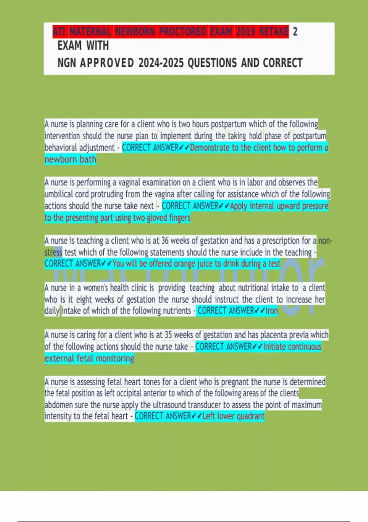 A nurse is planning care for a client who is two hours postpartum which of the following intervention should the nurse plan to implement during the taking hold phase of postpartum behavioral adjustment - CORRECT ANSWERDemonstrate to the client how to perform a newborn bath A nurse is performing a vaginal examination on a client who is in labor and observes the umbilical cord protruding from the vagina after calling for assistance which of the following actions should the nurse take next - CORRECT ANSWERApply internal upward pressure to the presenting part using two gloved fingers A nurse is teaching a client who is at 36 weeks of gestation and has a prescription for a non-stress test which of the following statements should the nurse include in the teaching - CORRECT ANSWERYou will be offered orange juice to drink during a test A nurse in a women's health clinic is providing teaching about nutritional intake to a client who is it eight weeks of gestation the nurse should instruct the client to increase her daily intake of which of the following nutrients - CORRECT ANSWERIron A nurse is caring for a client who is at 35 weeks of gestation and has placenta previa which of the following actions should the nurse take - CORRECT ANSWERInitiate continuous external fetal monitoring A nurse is assessing fetal heart tones for a client who is pregnant the nurse is determined the fetal position as left occipital anterior to which of the following areas of the clients abdomen sure the nurse apply the ultrasound transducer to assess the point of maximum intensity to the fetal heart - CORRECT ANSWERLeft lower quadrant