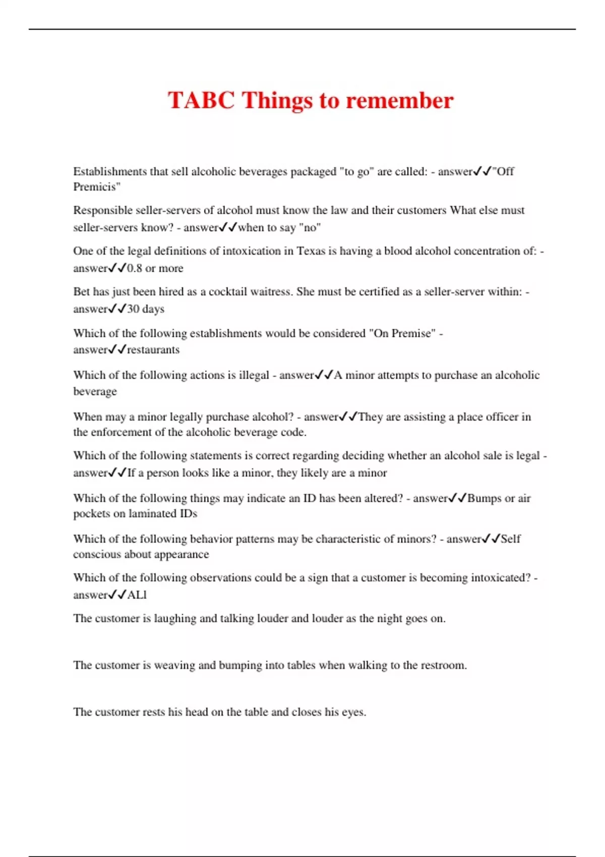 TABC Things to remember Establishments that sell alcoholic beverages packaged "to go" are called: - answer"Off Premicis" Responsible seller-servers of alcohol must know the law and their customers What else must seller-servers know? - answerwhen to say "no" One of the legal definitions of intoxication in Texas is having a blood alcohol concentration of: - answer0.8 or more Bet has just been hired as a cocktail waitress. She must be certified as a seller-server within: - answer30 days Which of the following establishments would be considered "On Premise" - answerrestaurants Which of the following actions is illegal - answerA minor attempts to purchase an alcoholic beverage When may a minor legally purchase alcohol? - answerThey are assisting a place officer in the enforcement of the alcoholic beverage code. Which of the following statements is correct regarding deciding whether an alcohol sale is legal - answerIf a person looks like a minor, they likely are a minor Which of the following things may indicate an ID has been altered? - answerBumps or air pockets on laminated IDs Which of the following behavior patterns may be characteristic of minors? - answerSelf conscious about appearance Which of the following observations could be a sign that a customer is becoming intoxicated? - answerALl The customer is laughing and talking louder and louder as the night goes on. The customer is weaving and bumping into tables when walking to the restroom. The customer rests his head on the table and closes his eyes.