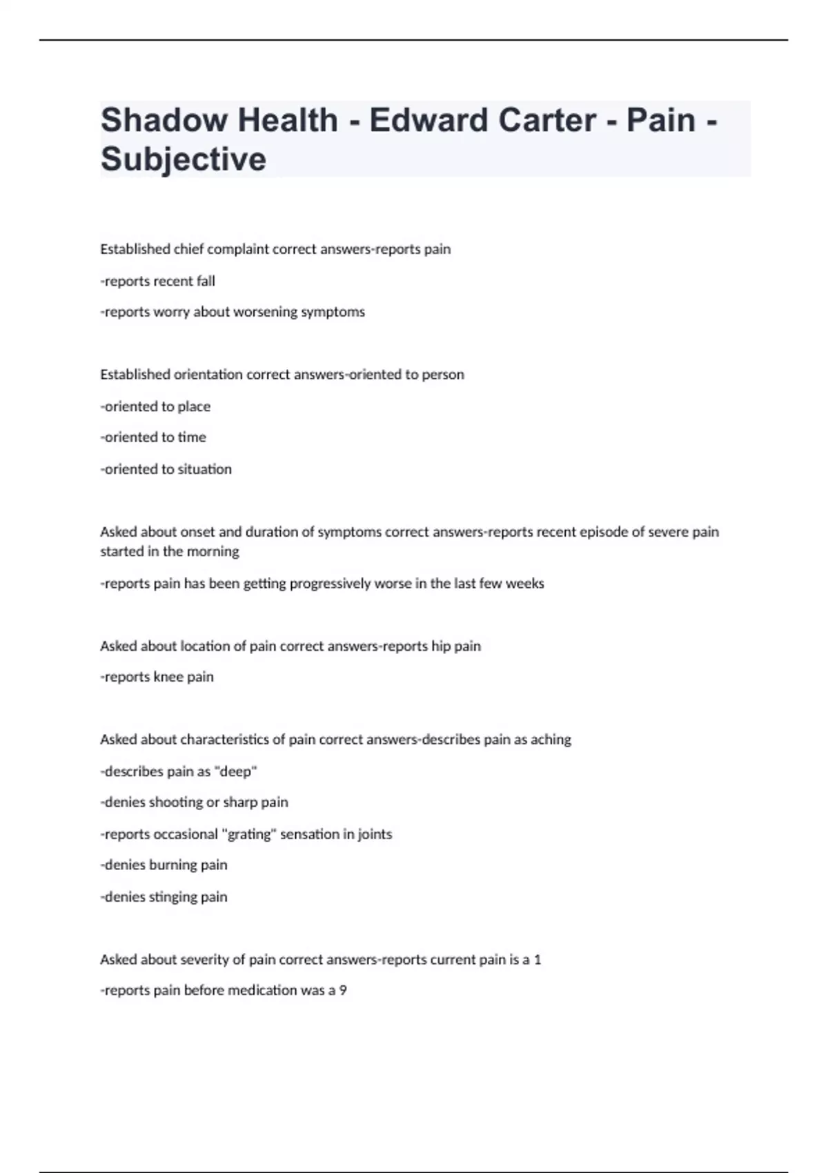 Shadow Health - Edward Carter - Pain - Subjective exam 2024 with 100% correct answers