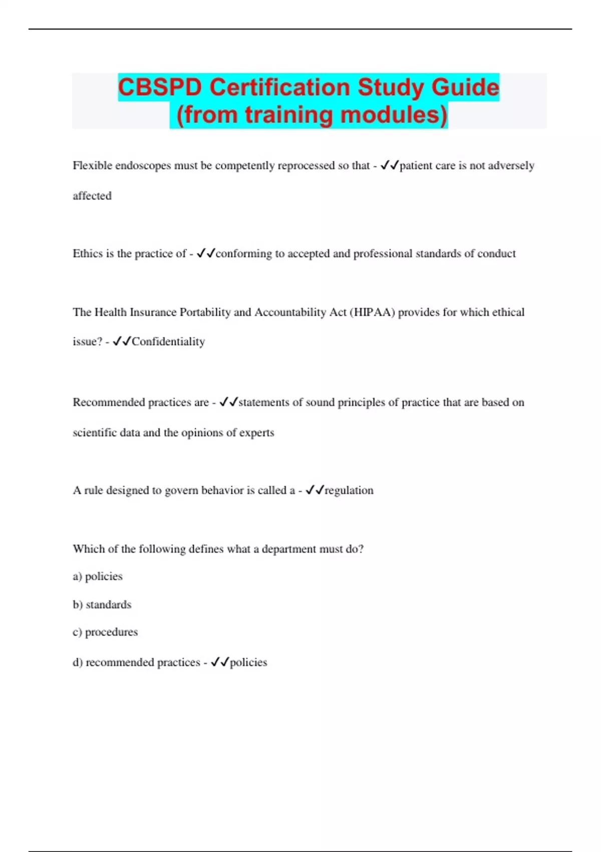 CBSPD Certification Study Guide (from training modules) Flexible endoscopes must be competently reprocessed so that - patient care is not adversely affected Ethics is the practice of - conforming to accepted and professional standards of conduct The Health Insurance Portability and Accountability Act (HIPAA) provides for which ethical issue? - Confidentiality Recommended practices are - statements of sound principles of practice that are based on scientific data and the opinions of experts A rule designed to govern behavior is called a - regulation Which of the following defines what a department must do? a) policies b) standards c) procedures d) recommended practices - policies Steps for performing a task are defined in a - procedure Which organization has published standards of infection prevention in processing flexible gastrointestinal endoscopes? - SGNA (Society for Gastroenterology Nurses and Associates) Which agency registers and regulates environmental disinfectants used on non-living things in healthcare facilities? - EPA (Environmental Protection Agency) Which agency regulates and assures that products are safe and effective before companies put them on the market? - FDA (Food and Drug Administration) Which agency requires medical device manufacturers to provide end users in healthcare facilities with specific instructions on how to reprocess their reusable products? - FDA (Food and Drug Administration) Compliance with Occupational Safety and Health Administration (OSHA) regulations is - required by law Monitoring the effectiveness of work performed in the GI/endoscopy suite is generally referred to as - quality assurance The policies and procedures for all reprocessing activities in the GI/endoscopy suite are usually reviewed and/or approved by the - Infection Prevention and Control Committee Which branch of science refers to the form and organization of body parts? - biology Which branch of science refers to the function of specific body parts? - physiology The smallest and most numerous structural units possessing the basic characteristics of life are called - cells The nucleus is the cell's - brain DNA (deoxyribonucleic acid) is found in which part of the cell? - nucleus What is the largest internal organ of the body? - liver The tendency of the body to maintain a stable internal environment is referred to as - homeostasis DNA is the only molecule in the body capable of - reproducing itself The term "pathogenic" means - disease-causing What branch of science deals with microorganisms and their effects on other living organisms? - microbiology Microorganisms are measured in - microns Bacteria are unicellular and reproduce by -