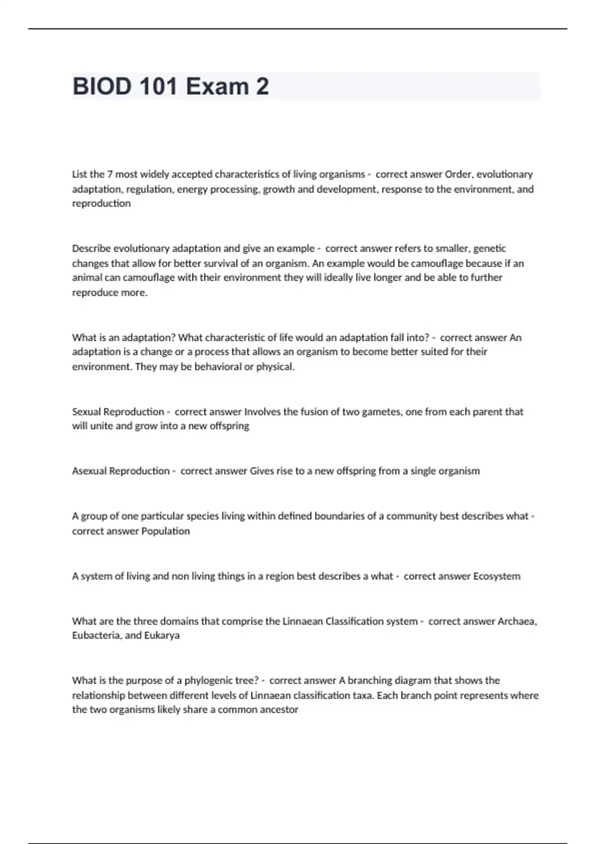biod 101 exam 2 questions and answers