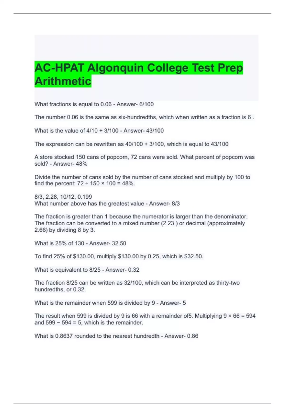 AC-HPAT Algonquin College Test Prep Arithmetic Questions and Answers 2024