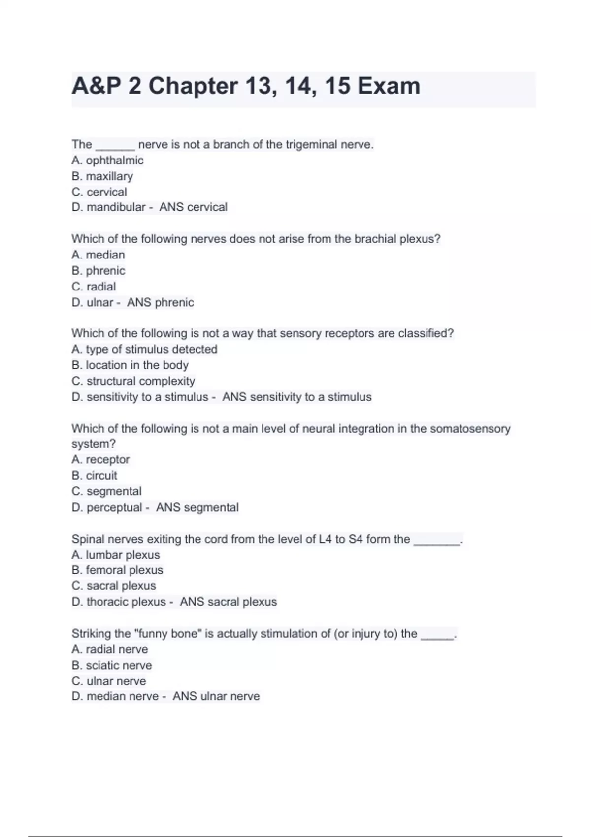 Test Bank For Anatomy and Physiology 2edition Chapter 13, 14, 15 Exam Questions and Answers Latest Updates (A+ GRADED 100% VERIFIED)