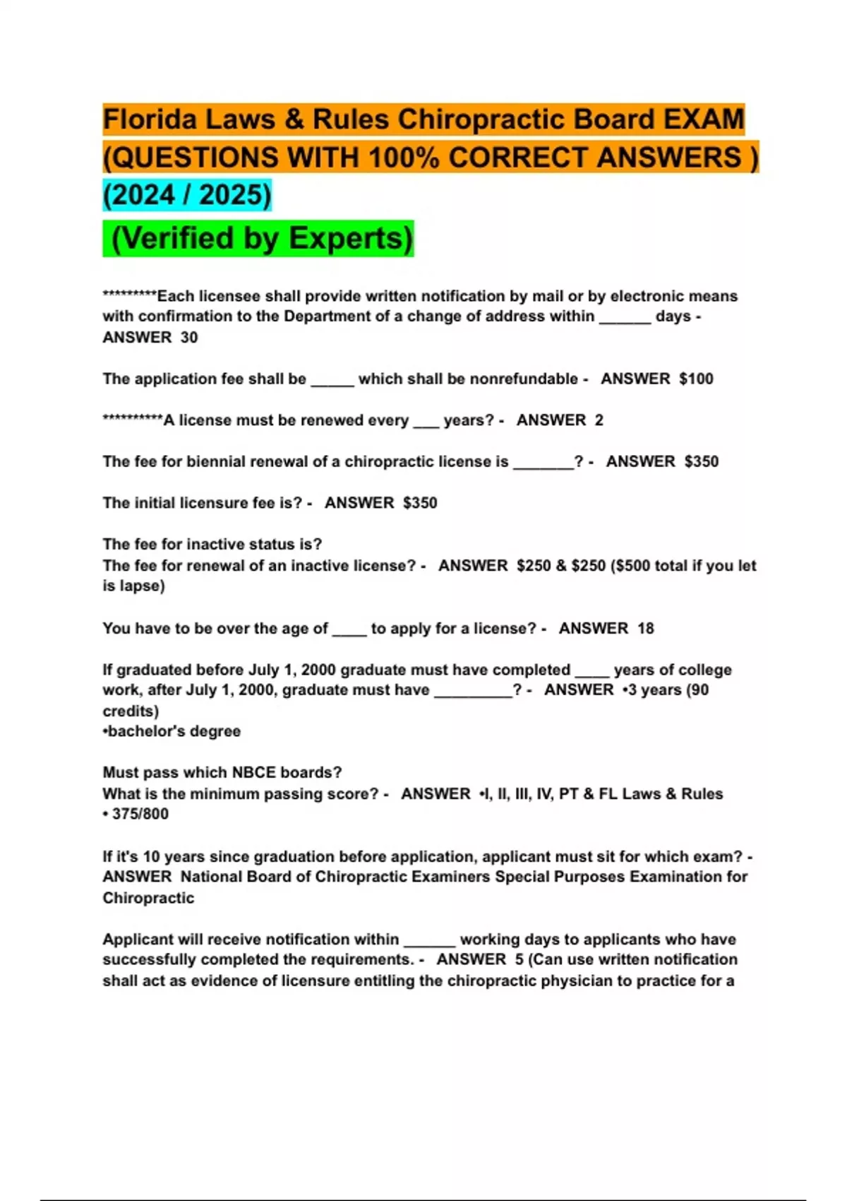 Florida Laws & Rules Chiropractic Board EXAM (QUESTIONS WITH 100% CORRECT ANSWERS ) (2024 / 2025) (Verified by Experts)