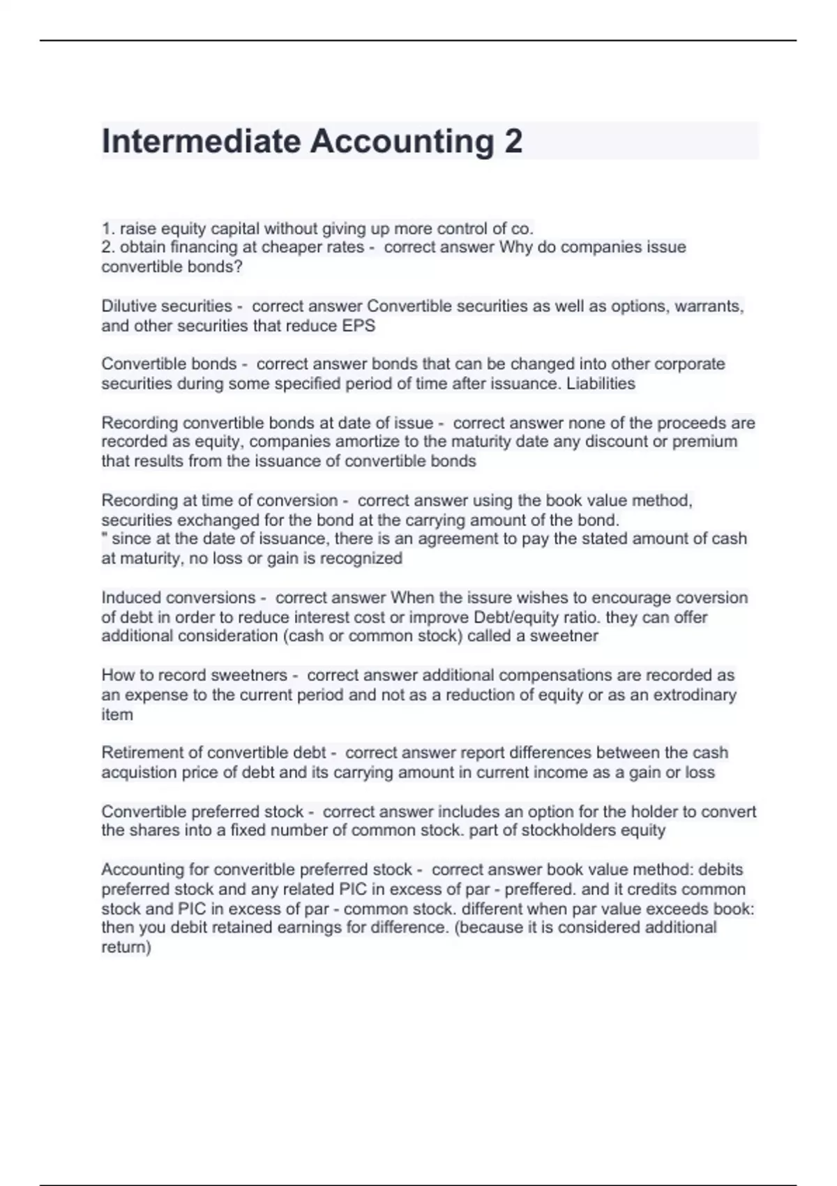 1. raise equity capital without giving up more control of co. 2. obtain financing at cheaper rates - correct answer Why do companies issue convertible bonds? Dilutive securities - correct answer Convertible securities as well as options, warrants, and other securities that reduce EPS Convertible bonds - correct answer bonds that can be changed into other corporate securities during some specified period of time after issuance. Liabilities Recording convertible bonds at date of issue - correct answer none of the proceeds are recorded as equity, companies amortize to the maturity date any discount or premium that results from the issuance of convertible bonds Recording at time of conversion - correct answer using the book value method, securities exchanged for the bond at the carrying amount of the bond. " since at the date of issuance, there is an agreement to pay the stated amount of cash at maturity, no loss or gain is recognized Induced conversions - correct answer When the issure wishes to encourage coversion of debt in order to reduce interest cost or improve Debt/equity ratio. they can offer additional consideration (cash or common stock) called a sweetner How to record sweetners - correct answer additional compensations are recorded as an expense to the current period and not as a reduction of equity or as an extrodinary item Retirement of convertible debt - correct answer report differences between the cash acquistion price of debt and its carrying amount in current income as a gain or loss Convertible preferred stock - correct answer includes an option for the holder to convert the shares into a fixed number of common stock. part of stockholders equity Accounting for converitble preferred stock - correct answer book value method: debits preferred stock and any related PIC in excess of par - preffered. and it credits common stock and PIC in excess of par - common stock. different when par value exceeds book: then you debit retained earnings for difference. (because it is considered additional return)