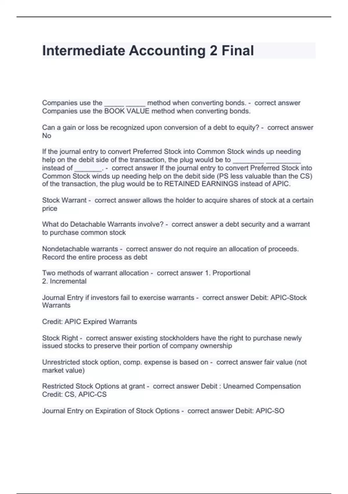 Companies use the _____ _____ method when converting bonds. - correct answer Companies use the BOOK VALUE method when converting bonds. Can a gain or loss be recognized upon conversion of a debt to equity? - correct answer No If the journal entry to convert Preferred Stock into Common Stock winds up needing help on the debit side of the transaction, the plug would be to ________ _________ instead of _______. - correct answer If the journal entry to convert Preferred Stock into Common Stock winds up needing help on the debit side (PS less valuable than the CS) of the transaction, the plug would be to RETAINED EARNINGS instead of APIC. Stock Warrant - correct answer allows the holder to acquire shares of stock at a certain price What do Detachable Warrants involve? - correct answer a debt security and a warrant to purchase common stock Nondetachable warrants - correct answer do not require an allocation of proceeds. Record the entire process as debt Two methods of warrant allocation - correct answer 1. Proportional 2. Incremental Journal Entry if investors fail to exercise warrants - correct answer Debit: APIC-Stock Warrants Credit: APIC Expired Warrants Stock Right - correct answer existing stockholders have the right to purchase newly issued stocks to preserve their portion of company ownership Unrestricted stock option, comp. expense is based on - correct answer fair value (not market value) Restricted Stock Options at grant - correct answer Debit : Unearned Compensation Credit: CS, APIC-CS Journal Entry on Expiration of Stock Options - correct answer Debit: APIC-SO