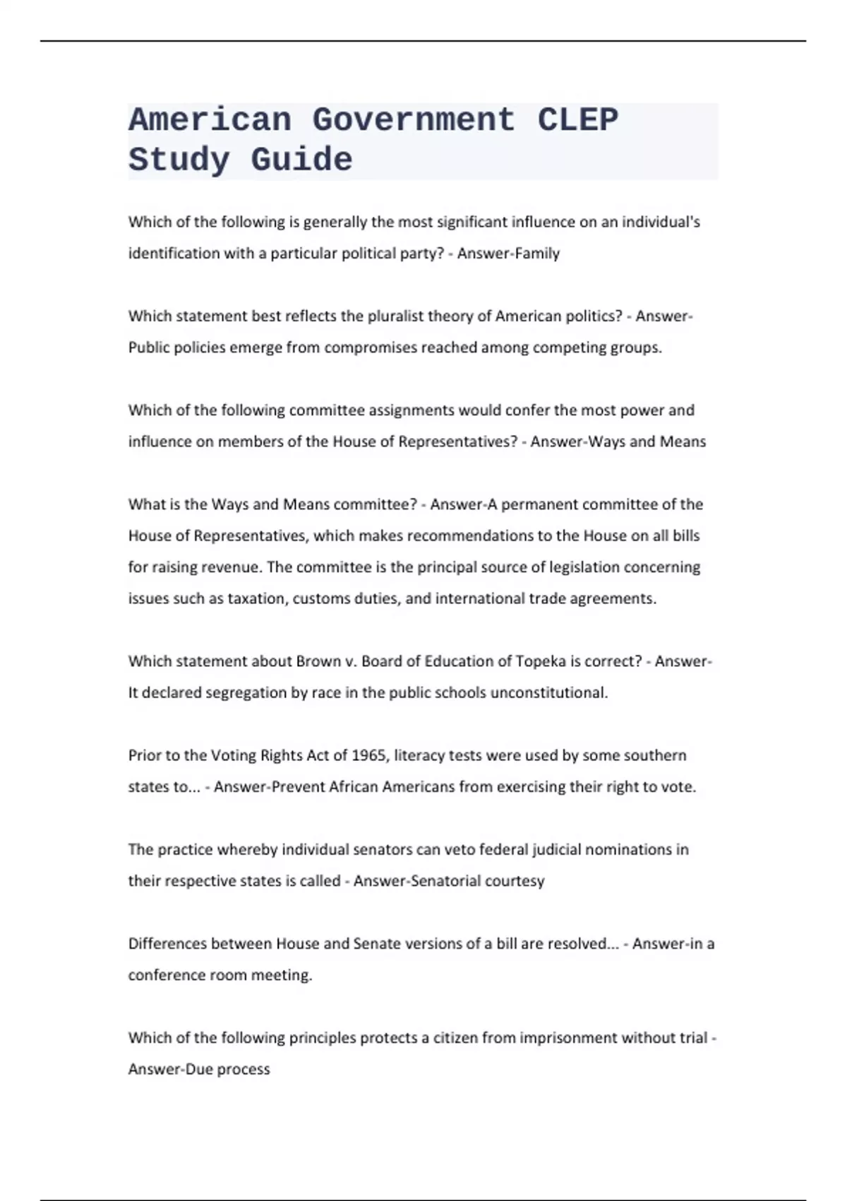 Which of the following is generally the most significant influence on an individual's identification with a particular political party? - Answer-Family Which statement best reflects the pluralist theory of American politics? - Answer- Public policies emerge from compromises reached among competing groups. Which of the following committee assignments would confer the most power and influence on members of the House of Representatives? - Answer-Ways and Means What is the Ways and Means committee? - Answer-A permanent committee of the House of Representatives, which makes recommendations to the House on all bills for raising revenue. The committee is the principal source of legislation concerning issues such as taxation, customs duties, and international trade agreements. Which statement about Brown v. Board of Education of Topeka is correct? - AnswerIt declared segregation by race in the public schools unconstitutional. Prior to the Voting Rights Act of 1965, literacy tests were used by some southern states to... - Answer-Prevent African Americans from exercising their right to vote. The practice whereby individual senators can veto federal judicial nominations in their respective states is called - Answer-Senatorial courtesy Differences between House and Senate versions of a bill are resolved... - Answer-in a conference room meeting. Which of the following principles protects a citizen from imprisonment without trial - Answer-Due process The passage of legislation in Congress often depends on mutual accommodations among members. This suggests that, to some extent, congressional behavior is based on - Answer-Deference to state legislatures The following statements accurately describe the president's veto power - Answer-1. A president sometimes threatens to veto a bill that is under discussion in order to influence congressional decision making. 2. Congress is usually unable to override a president's veto. All of the following issues were decided at the constitutional Convention of 1787 - Answer-Representation in the legislature; the method of electing the president; congressional power to override a presidential veto; qualifications for members of the House and Senate This is an example of soft money - Answer-Money that is given to a political party for advertisements about the party's goals The usefulness to the president of having cabinet members as political advisers is undermined by the fact that - Answer-the loyalties of cabinet members are often divided between loyalty to the president and loyalty to their own executive departments. In the electoral history of the United States third parties have been effective vehicles of protest when they - Answer-dramatized issues and positions that were being ignored by the major parties The following best defines the term "judicial activism" - Answer-The attempts by judges to influence public policy through their case decisions