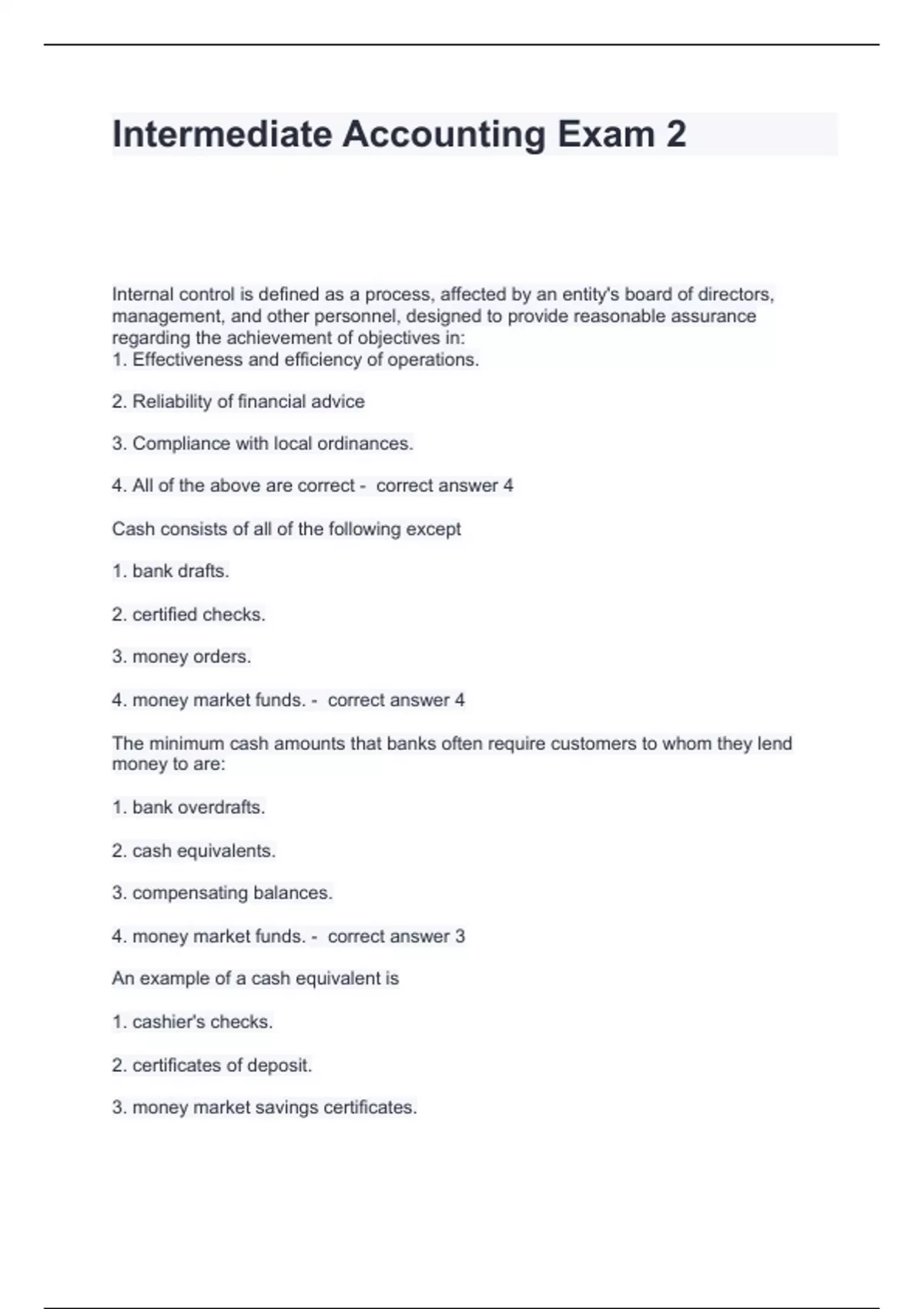 Internal control is defined as a process, affected by an entity's board of directors, management, and other personnel, designed to provide reasonable assurance regarding the achievement of objectives in: 1. Effectiveness and efficiency of operations. 2. Reliability of financial advice 3. Compliance with local ordinances. 4. All of the above are correct - correct answer 4 Cash consists of all of the following except 1. bank drafts. 2. certified checks. 3. money orders. 4. money market funds. - correct answer 4 The minimum cash amounts that banks often require customers to whom they lend money to are: 1. bank overdrafts. 2. cash equivalents. 3. compensating balances. 4. money market funds. - correct answer 3 An example of a cash equivalent is 1. cashier's checks. 2. certificates of deposit.