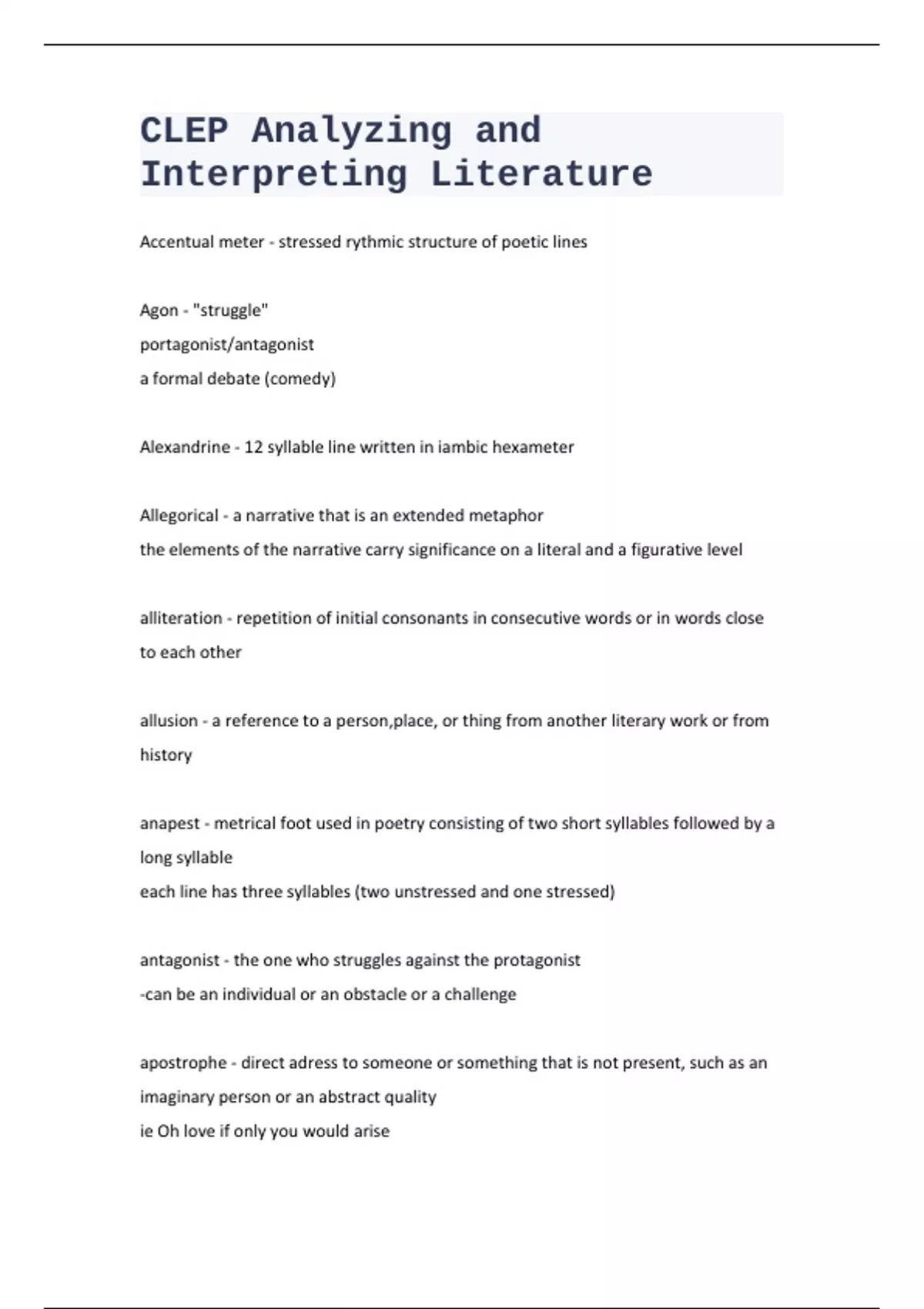 Accentual meter - stressed rythmic structure of poetic lines Agon - "struggle" portagonist/antagonist a formal debate (comedy) Alexandrine - 12 syllable line written in iambic hexameter Allegorical - a narrative that is an extended metaphor the elements of the narrative carry significance on a literal and a figurative level alliteration - repetition of initial consonants in consecutive words or in words close to each other allusion - a reference to a person,place, or thing from another literary work or from history anapest - metrical foot used in poetry consisting of two short syllables followed by a long syllable each line has three syllables (two unstressed and one stressed) antagonist - the one who struggles against the protagonist -can be an individual or an obstacle or a challenge apostrophe - direct adress to someone or something that is not present, such as an imaginary person or an abstract quality ie Oh love if only you would arise argumentative - describes writing that establishes a position and supports it with evidence assonance - repetition of vowel sounds more common in verse than prose aubade - a morning love song opposite of a serenade a song to a sleeping woman also refers to a song evoking daybreak ballad - a narrative folk song or a narrative set to music ballad stanza - a four line stanza consisting of alternating four and three stress lines 8 and 6 beat -the second and fourth lies rhyme (abcb) bathos - abruspt change in style going from exalted to mundane, producing a ludicrous effect blank verse - unrythmed iambic pentameter caesura - a complete pause in a line of poetry usually right in the middle catastrophe - final resolution in a poem or narrative that unravels the plot and concludes the work the misfortune experienced by the tragic hero catharsis - "cleansing" "purging" in a tragedy, the moment for purging or relieving of emotions for the audience