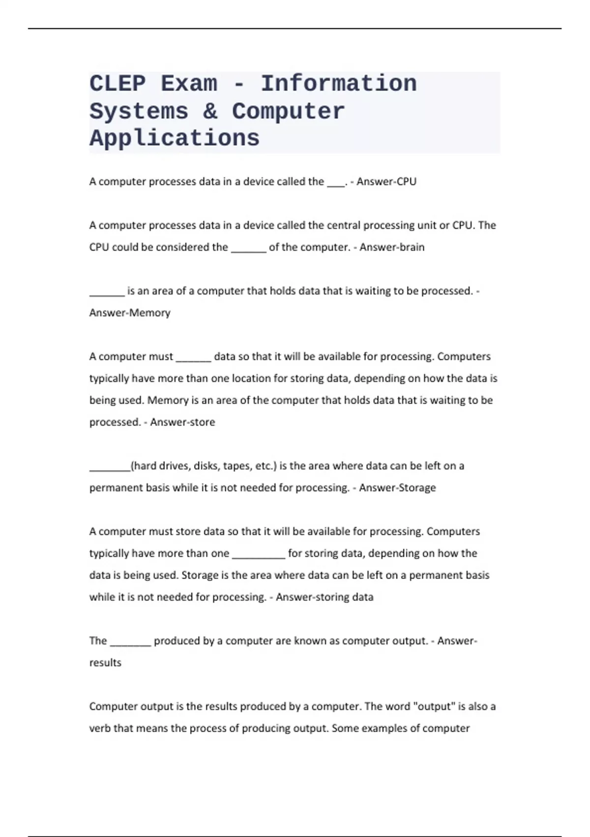 A computer processes data in a device called the ___. - Answer-CPU A computer processes data in a device called the central processing unit or CPU. The CPU could be considered the ______ of the computer. - Answer-brain ______ is an area of a computer that holds data that is waiting to be processed. - Answer-Memory A computer must ______ data so that it will be available for processing. Computers typically have more than one location for storing data, depending on how the data is being used. Memory is an area of the computer that holds data that is waiting to be processed. - Answer-store _______(hard drives, disks, tapes, etc.) is the area where data can be left on a permanent basis while it is not needed for processing. - Answer-Storage A computer must store data so that it will be available for processing. Computers typically have more than one _________ for storing data, depending on how the data is being used. Storage is the area where data can be left on a permanent basis while it is not needed for processing. - Answer-storing data The _______ produced by a computer are known as computer output. - Answer- results Computer output is the results produced by a computer. The word "output" is also a verb that means the process of producing output. Some examples of computer output include reports, documents, music, graphs, and pictures. An output device displays, _______, or transmits the results of processing. - Answer-prints The term "hardware" refers to the computer itself and to components called __________________ that expand the computer's input, output, and storage capabilities. - Answer-peripheral devices Examples of _________ include the monitor, hard drives, memory, the CPU, printers, etc. - Answer-hardware ____________ drives plug into the computer's USB ports and have memory capacities of up to many gigabytes. - Answer-Flash memory When plugged into a USB port, flash memory drives show up as an _________ drive and are a convenient way to transport and transfer data. - Answer-external Hypertext allows one or more words in a document to act as a ____ to another document. - Answer-link Hypertext allows you to click on text to be taken to another part of the same page, or a different document or web page altogether. Hypertext is the basis of today's ________________--you click on hypertext links to be taken from one webpage to the next. - Answer-world wide web Computer hardware in and of itself does not provide a particularly useful tool. To be useful, a computer requires a computer program or ________, which is a set of instructions that tells a computer how to perform a particular task. - Answer- software Computer software is what tells the computer what to do. There are many types of software--for instance, right now you are using web browsing software to view this website. Computers can become even more effective when connected to other computers so that people can share _____________. - Answer-information Traditionally, computers have been classified into four categories, from least to most powerful, are microcomputers, minicomputers, mainframe computers, and ______________. - Answer-supercomputers A computer is placed in one of these categories based on its technology, physical size, _____________, and cost. - Answer-performance Microcomputers, also known as ________ computers, are typically found in homes and small businesses. Prices range from $500 to $5,000 but consumers typically purchase systems in the middle of this range, spending from $1,000 to $2,000. - Answer-personal Microcomputers are also known as personal computers, and is most likely the type of computer you are using right now to access the internet. One measure of microcomputer speed is the speed of the processor, which is measured in __________ (Mhz) or gigahertz (Ghz). - Answer-megahertz A ____________ is somewhat more powerful than a microcomputer and can carry out the processing tasks for several people working at terminals that are connected to the minicomputer. - Answer-minicomputer An example of a minicomputer would be a mid-range _______. - Answer-server A ________ is an input and output device that resembles a microcomputer because it has a keyboard and screen. - Answer-terminal Unlike a microcomputer, however, a terminal does not have ___________ capability. When you input a processing request from a terminal, your request