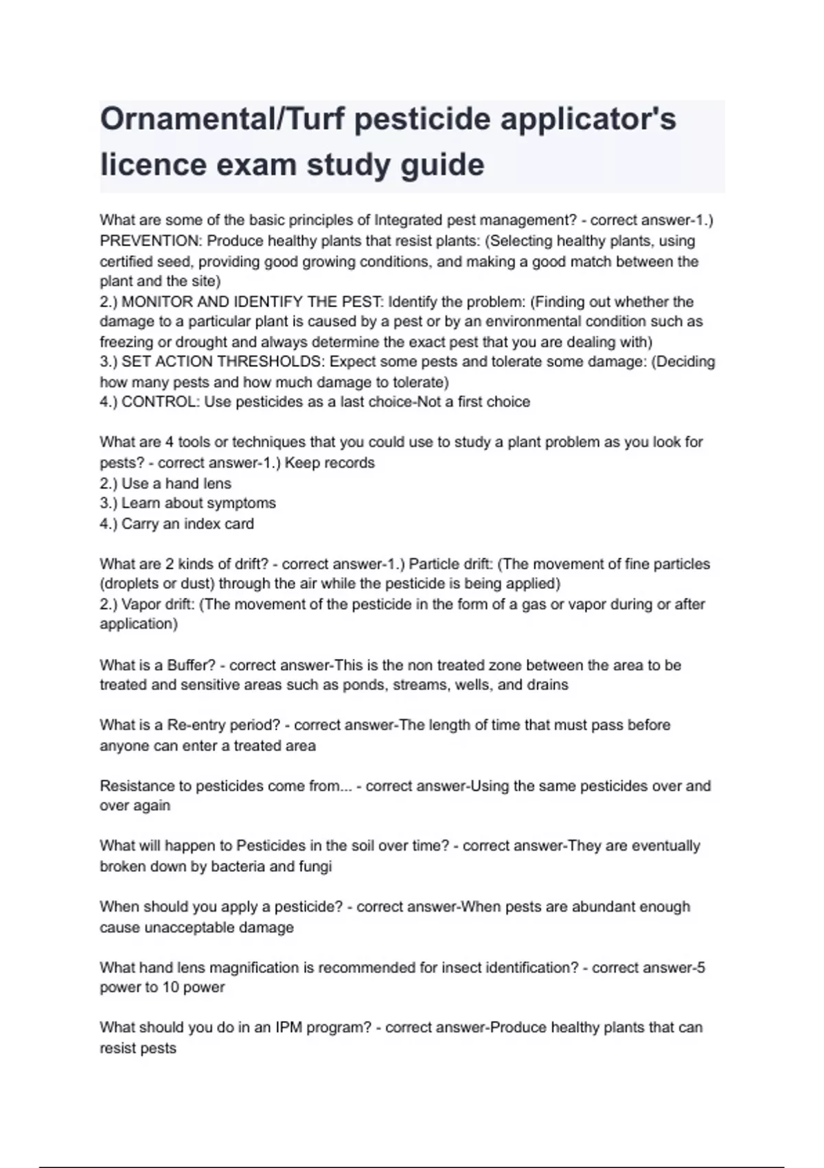 Ornamental/Turf pesticide applicator's licence exam study guide questions and answers latest 2024