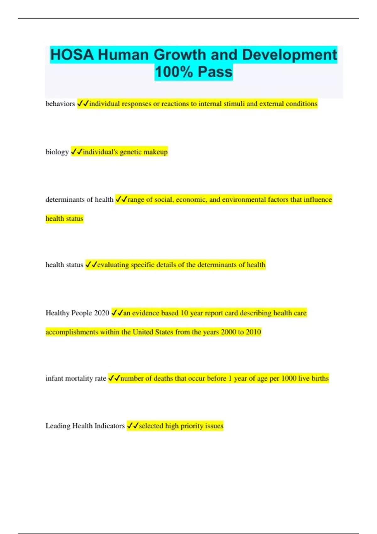 HOSA Human Growth and Development 100% Pass behaviors ✔✔individual responses or reactions to internal stimuli and external conditions biology ✔✔individual's genetic makeup determinants of health ✔✔range of social, economic, and environmental factors that influence health status health status ✔✔evaluating specific details of the determinants of health Healthy People 2020 ✔✔an evidence based 10 year report card describing he alth care accomplishments within the United States from the years 2000 to 2010 infant mortality rate ✔✔number of deaths that occur before 1 year of age per 1000 live births Leading Health Indicators ✔✔selected high priority issues life expectancy ✔✔average number of years a person born in a given year is expected to live physical environment ✔✔thought of as that which can be seen, touched, heard, smelled, and tasted social environment ✔✔interactions with family, friends, coworkers, and others in the co mmunity accreditation ✔✔process by which an institution is recognized as meeting specific predetermined standards of care Federal Register ✔✔federal legislation concerning health care which is recorded and published health maintenance organizations (HMO s) ✔✔provide care for prepaid members homeopathy ✔✔the use of minute proportions of naturally occurring chemicals for their healing power informed consent ✔✔the nurse is responsible to sign as a witness that a patient has received info regarding risks, a dvantages, and alternatives available for a planned procedure in a language understood by the patient managed care organizations (MCOs) ✔✔attempt to standardize and control costs of health care Medicaid ✔✔benefits are provided on a basis of need or poverty Medicare ✔✔benefits are received after contributions are maid through payroll deductions nurse practice acts ✔✔defines the scope of practice for nurses within that state Nursing Licensure Co mpact (NLC) ✔✔enables traveling nurses to function in multiple states Occupational Safety and Health Act (OSHA) ✔✔requires standards of safety to be maintained by employers to protect the health and safety of employees and mandates the reporting of injuri es sustained by workers