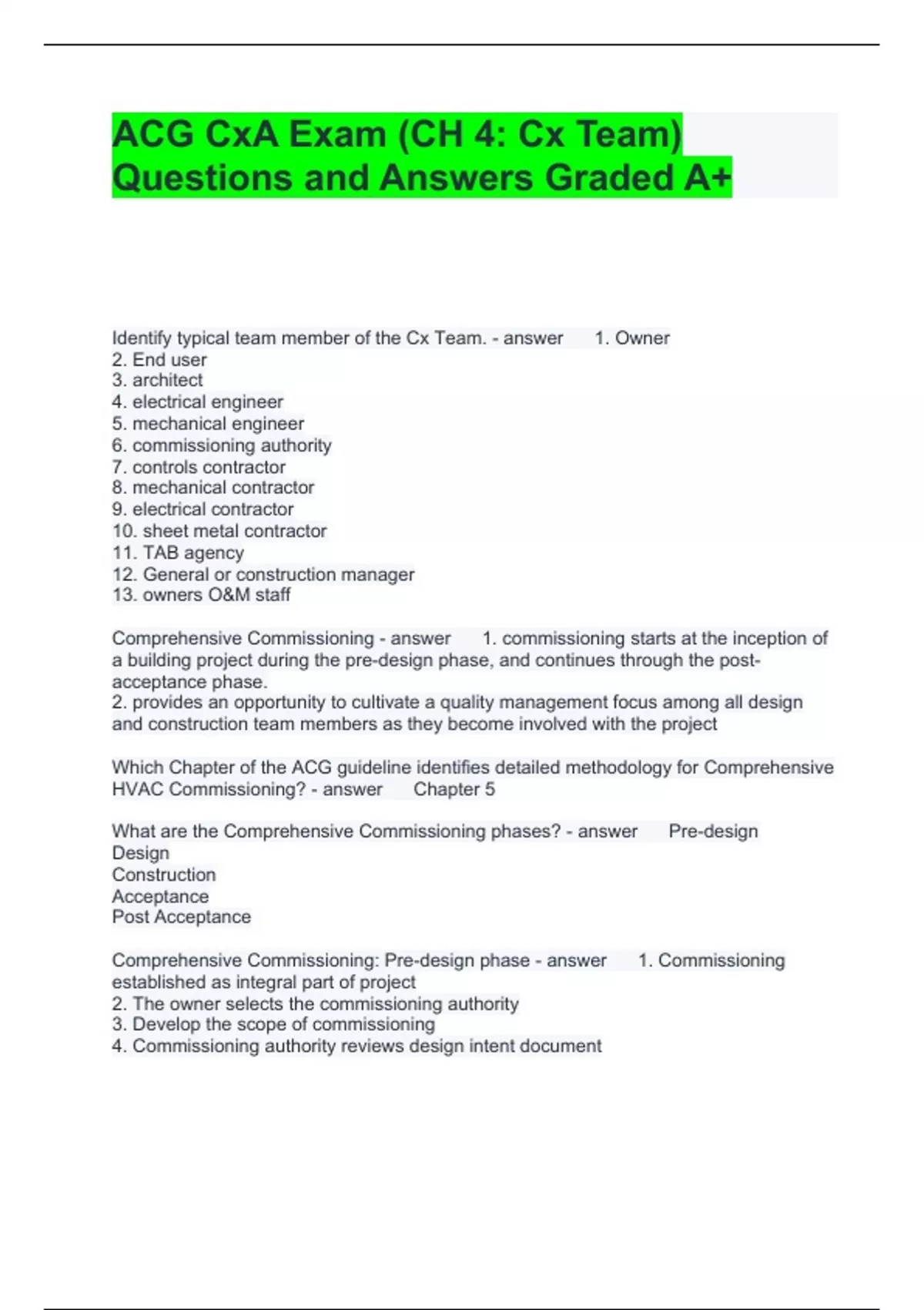 ACG CxA Exam (CH 4. Cx Team) Questions and Answers Graded A+,100% Correct