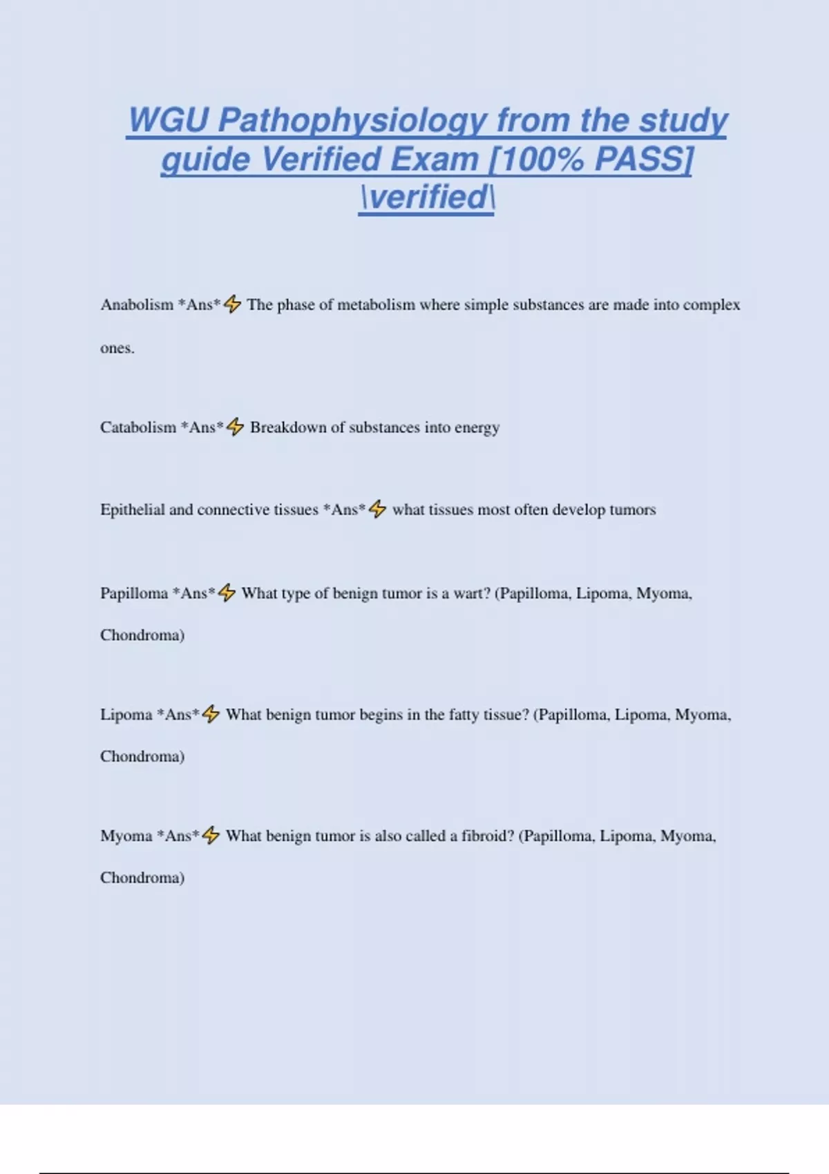 WGU Pathophysiology from the study guide Verified Exam [100% PASS] verified Anabolism *Ans* The phase of metabolism where simple substances are made into complex ones. Catabolism *Ans* Breakdown of substances into energy Epithelial and connective tissues *Ans* what tissues most often develop tumors Papilloma *Ans* What type of benign tumor is a wart? (Papilloma, Lipoma, Myoma, Chondroma) Lipoma *Ans* What benign tumor begins in the fatty tissue? (Papilloma, Lipoma, Myoma, Chondroma) Myoma *Ans* What benign tumor is also called a fibroid? (Papilloma, Lipoma, Myoma, Chondroma) Chondroma *Ans* What benign tumor is of cartilage cells? (Papilloma, Lipoma, Myoma, Chondroma) Sarcoma *Ans* What type of tumor can be found anywhere and arises from connective tissue? Fevers and night sweats *Ans* What are early signs of lymphoma? radiation therapy *Ans* Planting seeds into a malignant prostate and irradiating to reduce damage to healthy tissue is called: vesicle *Ans* Skin lesion described as a small fluid filled elevation of the skin (eg blister) [vesicle, pustule, macule, papule] pustule *Ans* Skin lesion described as an elevation of the skin containing white blood cells and cell debris [vesicle, pustule, macule, pa