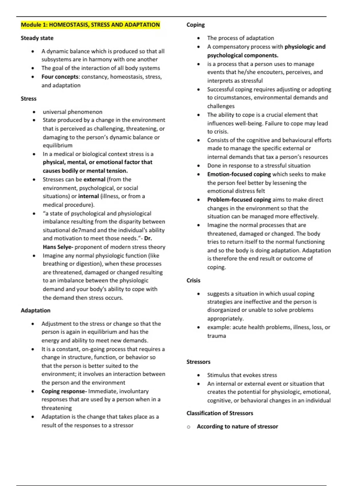 Module 1: HOMEOSTASIS, STRESS AND ADAPTATION Steady state ⦁ A dynamic balance which is produced so that all subsystems are in harmony with one another ⦁ The goal of the interaction of all body systems ⦁ Four concepts: constancy, homeostasis, stress, and adaptation Stress ⦁ universal phenomenon ⦁ State produced by a change in the environment that is perceived as challenging, threatening, or damaging to the person’s dynamic balance or equilibrium ⦁ In a medical or biological context stress is a physical, mental, or emotional factor that causes bodily or mental tension. ⦁ Stresses can be external (from the environment, psychological, or social situations) or internal (illness, or from a medical procedure). ⦁ “a state of psychological and physiological imbalance resulting from the disparity between situational de7mand and the individual's ability and motivation to meet those needs.”- Dr. Hans Selye- proponent of modern stress theory ⦁ Imagine any normal physiologic function (like breathing or digestion), when these processes are threatened, damaged or changed resulting to an imbalance between the physiologic demand and your body’s ability to cope with the demand then stress occurs. Adaptation ⦁ Adjustment to the stress or change so that the person is again in equilibrium and has the energy and ability to meet new demands. ⦁ It is a constant, on-going process that requires a change in structure, function, or behavior so that the person is better suited to the environment; it involves an interaction between the person and the environment ⦁ Coping response- Immediate, involuntary responses that are used by a person when in a threatening ⦁ Adaptation is the change that takes place as a result of the responses to a stressor Coping ⦁ The process of adaptation ⦁ A compensatory process with physiologic and psychological components. ⦁ is a process that a person uses to manage events that he/she encouters, perceives, and interprets as stressful ⦁ Successful coping requires adjusting or adopting to circumstances, environmental demands and challenges ⦁ The ability to cope is a crucial element that influences well-being. Failure to cope may lead to crisis. ⦁ Consists of the cognitive and behavioural efforts made to manage the specific external or internal demands that tax a person’s resources ⦁ Done in response to a stressful situation ⦁ Emotion-focused coping which seeks to make the person feel better by lessening the emotional distress felt ⦁ Problem-focused coping aims to make direct changes in the environment so that the situation can be managed more effectively