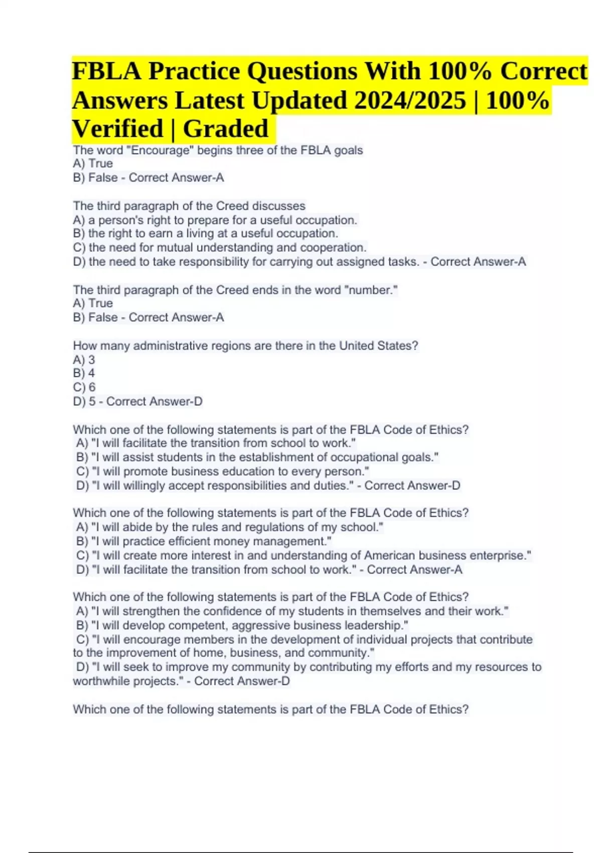 FBLA Practice Questions With 100% Correct Answers Latest Updated 2024/2025 | 100% Verified | Graded A+. The third paragraph of the Creed discusses A) a person's right to prepare for a useful occupation. B) the right to earn a living at a useful occupation. C) the need for mutual understanding and cooperation. D) the need to take responsibility for carrying out assigned tasks. - Correct Answer-A The third paragraph of the Creed ends in the word "number." A) True B) False - Correct Answer-A How many administrative regions are there in the United States? A) 3 B) 4 C) 6 D) 5 - Correct Answer-D Which one of the following statements is part of the FBLA Code of Ethics? A) "I will facilitate the transition from school to work." B) "I will assist students in the establishment of occupational goals." C) "I will promote business education to every person." D) "I will willingly accept responsibilities and duties." - Correct Answer-D Which one of the following statements is part of the FBLA Code of Ethics? A) "I will abide by the rules and regulations of my school." B) "I will practice efficient money management." C) "I will create more interest in and understanding of American business enterprise." D) "I will facilitate the transition from school to work." - Correct Answer-A Which one of the following statements is part of the FBLA Code of Ethics? A) "I will strengthen the confidence of my students in themselves and their work." B) "I will develop competent, aggressive business leadership." C) "I will encourage members in the development of individual projects that contribute to the improvement of home, business, and community." D) "I will seek to improve my community by contributing my efforts and my resources to worthwhile projects." - Correct Answer-D Which one of the following statements is part of the FBLA Code of Ethics? FBLA Practice Questions With 100% Correct Answers Latest Updated 2024/2025 | 100% Verified | Graded A) "I will prepare for a useful occupation and carry on that occupation that brings the greatest good to the greatest number." B) "I will facilitate the transition from school to careers." C) "I will accept responsibility to work efficiently and think clearly." D) "I will exercise initiative and responsibility and will cooperate with my employer and fellow workers." - Correct Answer-D The FBLA Creed has how many stanzas? A) nine B) seven C) eight D) six - Correct Answer-B One of the FBLA goals is to: A) develop the qualities necessary in becoming a responsible business leader B) create more interest in and understanding of American business enterprise C) cooperate with my employer and fellow workers D) facilitate the transition from school to post secondary education - Correct Answer-B Which one of the following is part of one of the stanzas of the FBLA Creed? A) I will abide by the rules and regulations of my school. B) I shall willingly accept responsibilities and duties. C) I shall seek to improve my community by contributing my efforts and my resources to worthwhile projects. D) I agree to do my utmost to bring about understanding and cooperation among all these groups. - Correct Answer-D One of the stanzas of the FBLA Creed is: A) I promise to actively work toward improving social, political, community, and family life. B) I shall develop the qualities necessary to actively work toward improving social, political, community, and family life. C) I will actively work toward improving social, political, community, and family life. D) I believe every person should actively work toward improving social, political, community, and family life - Correct Answer-D The FBLA goal is to assist students in the establishment of: A) leadership qualities B) school loyalty C) occupational goals D) efficient money management - Correct Answer-C The FBLA Creed states I have the responsibility to work efficiently and to: A) improve my self B) use my abilities C) effectively transition from school to work D) think clearly - Correct Answer-D Choose the correct FBLA Creed stanza. A) I believe every person has the obligation to earn a living at a useful occupation. B) I believe every person has the ability to earn a living at a useful occupation. C) I believe every person has the responsibility to earn a living at a useful occupation. D) I believe every person has the right to earn a living at a useful occupation. - Correct Answer-D The official emblem and insignia item designs are described and protected from infringement by registration in the U.S. Patent Office under Trademark Act of A) 1947. B) 1948. C) 1946. D) 1949. - Correct Answer-C The Dorothy L. Travis Award is also called the A) Gold Key Chapter Award. B) Membership Recruitment Recognition Award. C) Local Chapter Annual Business Report. D) Parliamentary Procedure Award. - Correct Answer-D The FBLA Program of Work form includes the FBLA-PBL A) Pledge. B) Creed. C) Code of Ethics. D) Goals. - Correct Answer-D Which event can be taken by 11th and 12th grade FBLA members? A) Introduction to Business B) Business Calculations C) Introduction to Financial Math D) Introduction to Business Presentation - Correct Answer-B According to the FBLA Format Guide, the title of a report is keyed in A) title case followed by a DS. B) all caps followed by a DS. C) all caps followed by a QS. D) title case followed by a TS. - Correct Answer-C In 1997, Mr. Edward D. Miller retired as president and chief executive officer of the national association. Who took his place? A) Ms. Dorothy Travis B) Ms. Jean Buckley C) Mr. Hamden L. Forkner D) Mr. Conrad N. Hilton - Correct Answer-B Business reports are used extensively to inform management, staff, stockholders, and the general public about all aspects of the business. This award named for ______________ recognizes FBLA chapters that effectively summarize their year's activities. A) Ms. Dorothy Travis B) Mr. Hamden L. Forkner C) Ms. Jean Buckley D) Mr. Conrad N. Hilton - Correct Answer-B If your local FBLA chapter ha