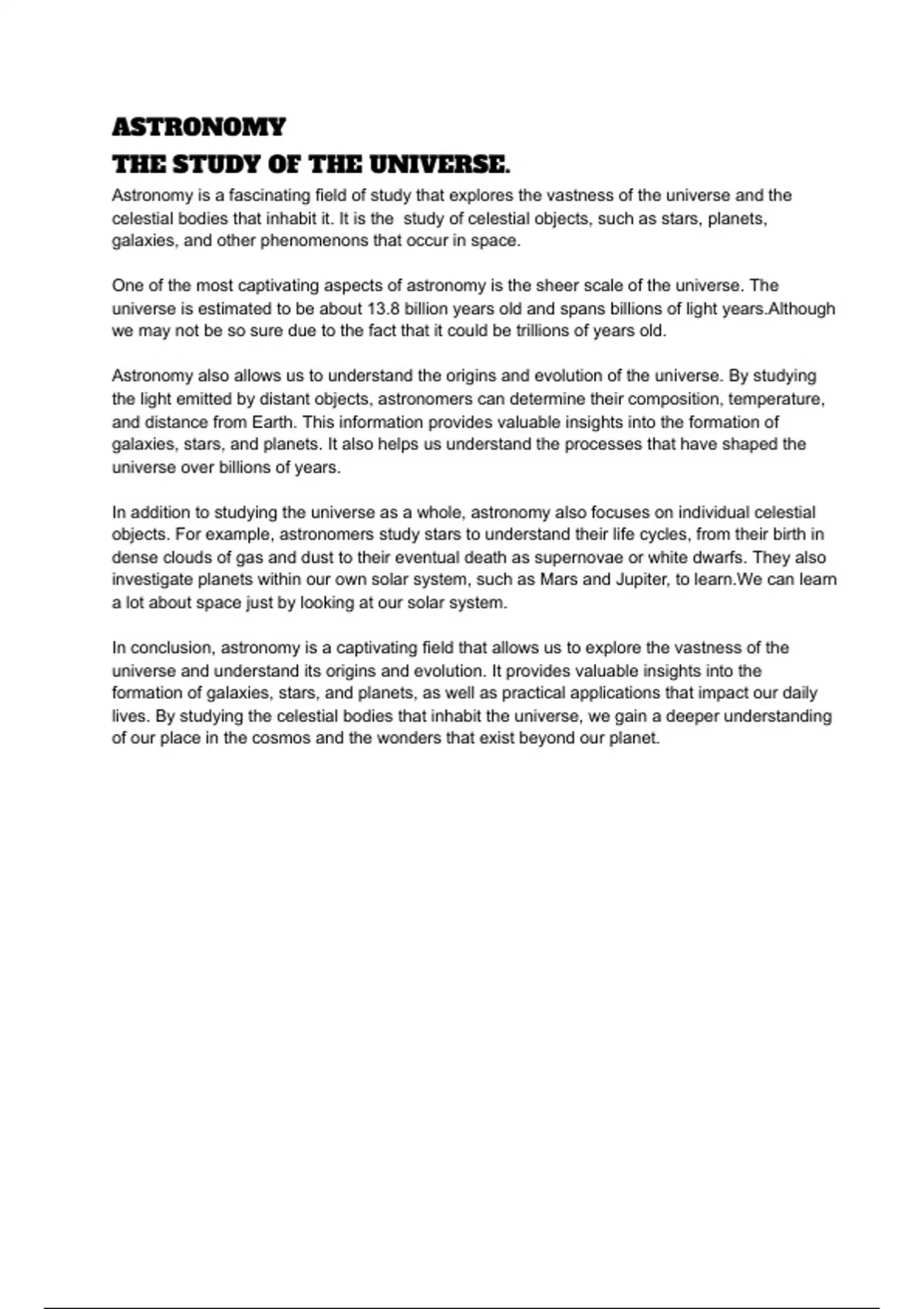 This Document sums up the whole profound purpose in Astronomy and provides information that is necessary for anyone taking Astronomy to understand the basics of overall Astronomy.