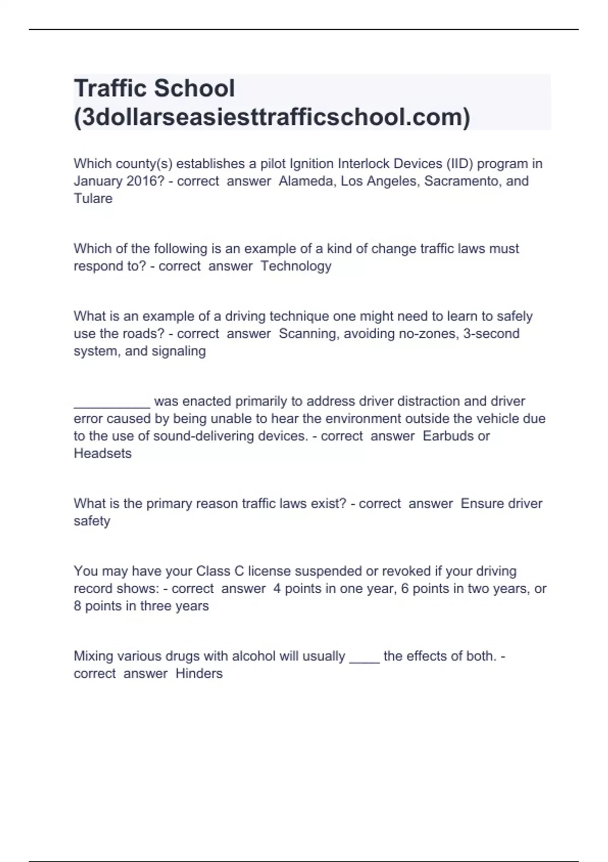 Traffic School Question and answers correctly solved 2024 Which county(s) establishes a pilot Ignition Interlock Devices (IID) program in January 2016? - correct answer Alameda, Los Angeles, Sacramento, and Tulare Which of the following is an example of a kind of change traffic laws must respond to? - correct answer Technology What is an example of a driving technique one might need to learn to safely use the roads? - correct answer Scanning, avoiding no-zones, 3-second system, and signaling __________ was enacted primarily to address driver distraction and driver error caused by being unable to hear the environment outside the vehicle due to the use of sound-delivering devices. - correct answer Earbuds or Headsets What is the primary reason traffic laws exist? - correct answer Ensure driver safety You may have your Class C license suspended or revoked if your driving record shows: -